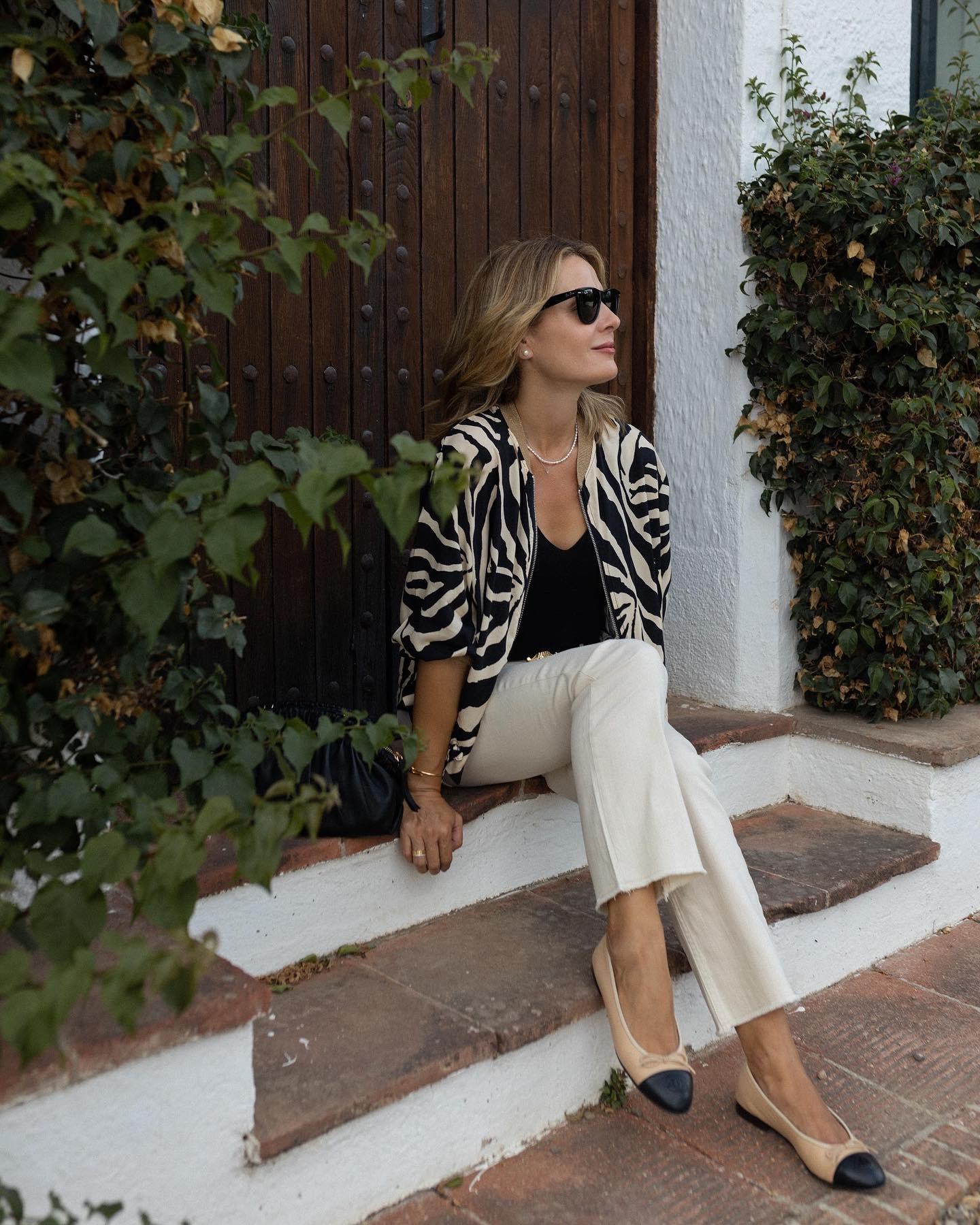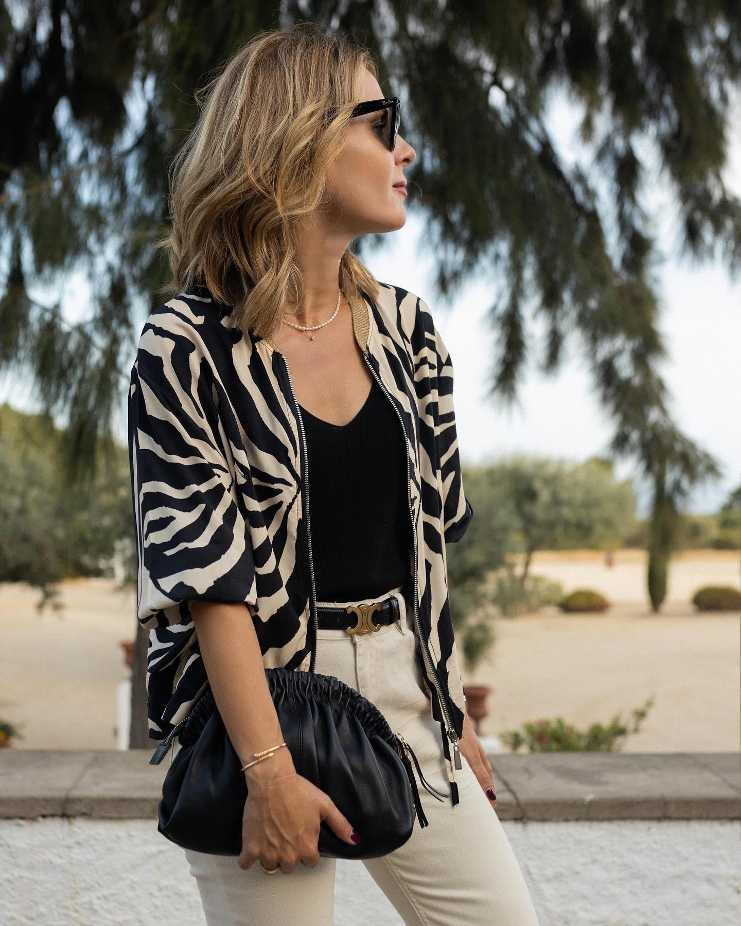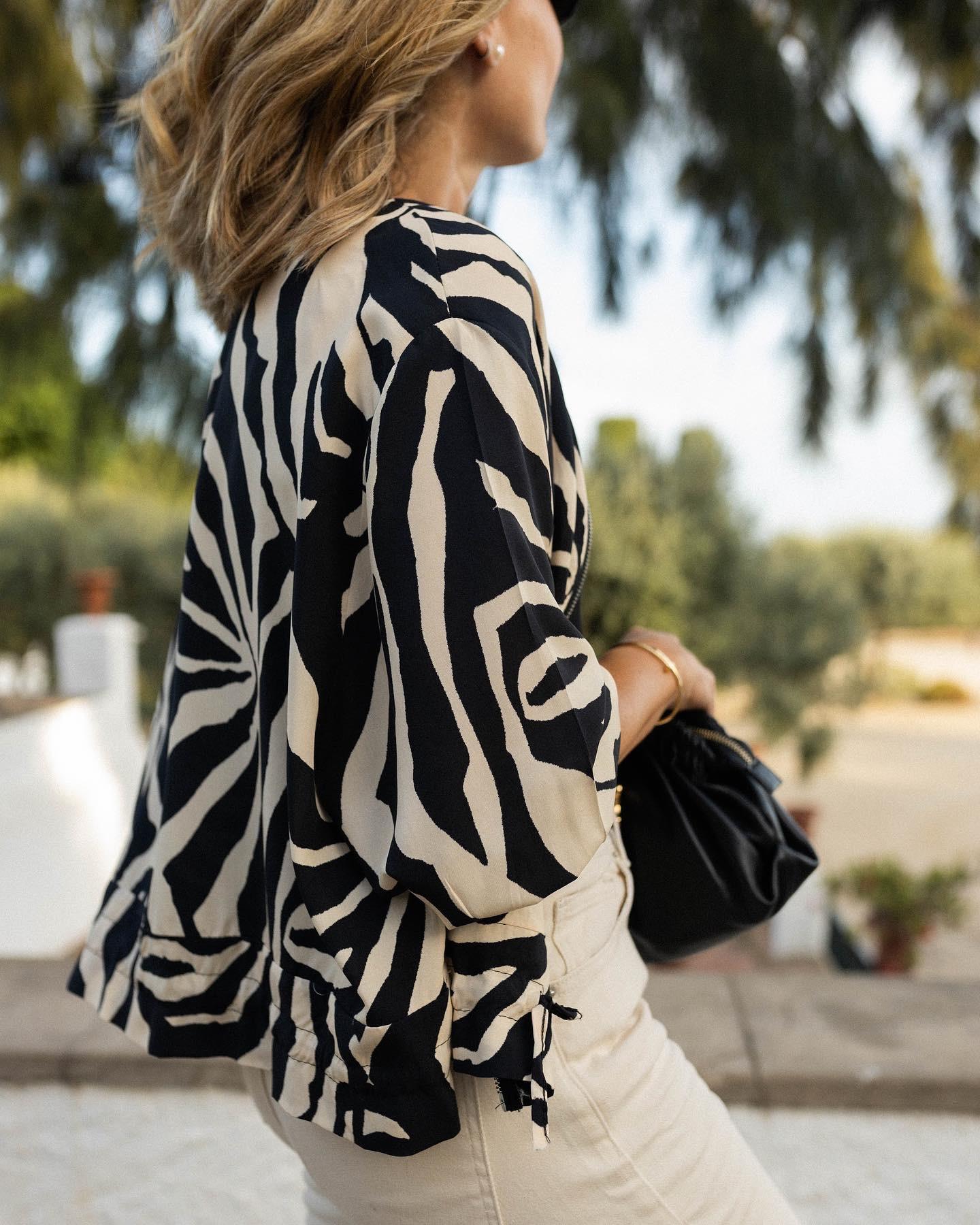 Nueva Bomber con estampado de zebra y detalles dorados en puño, cuello y mangas.