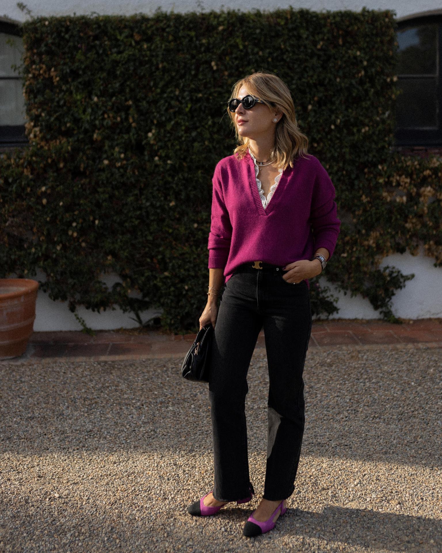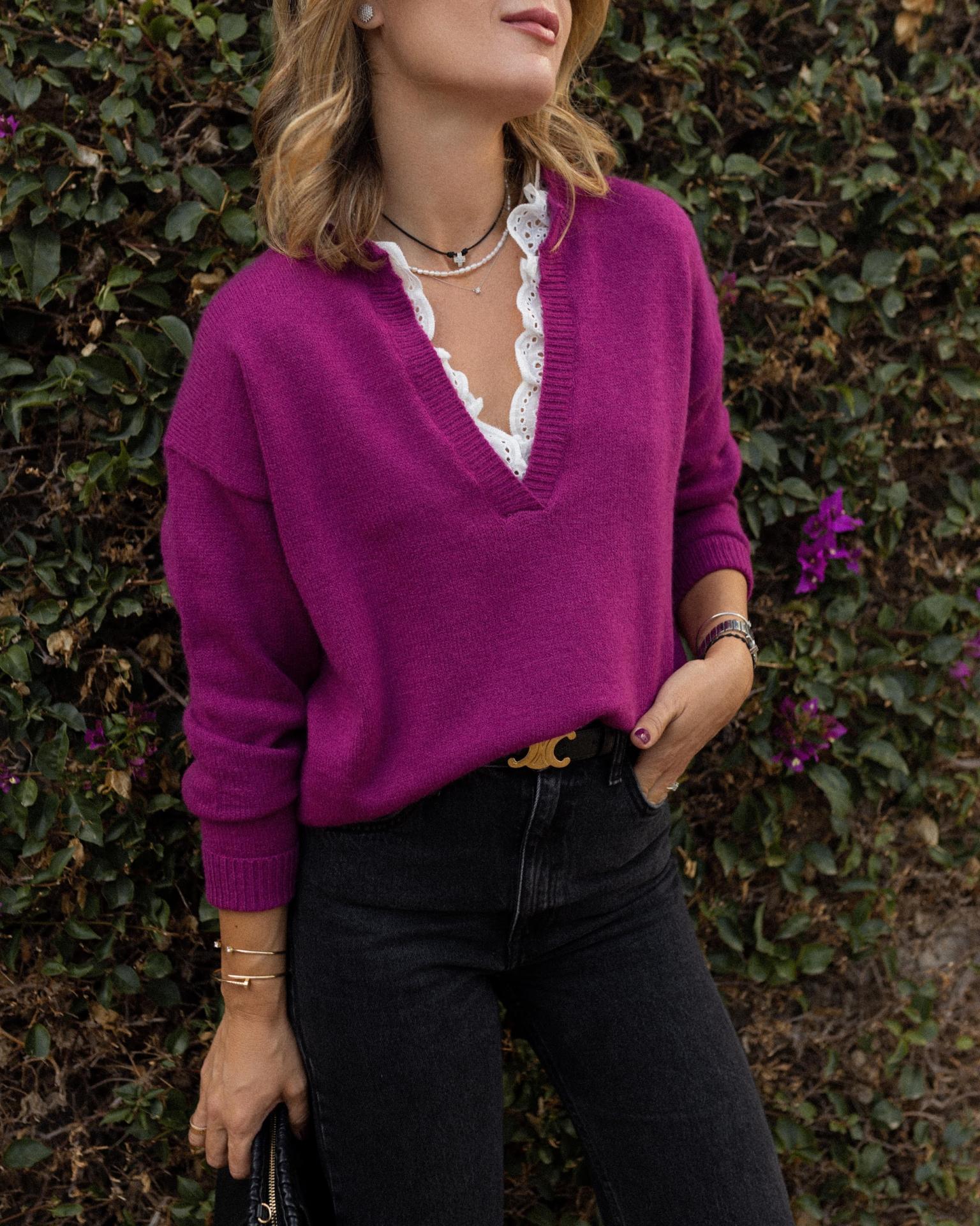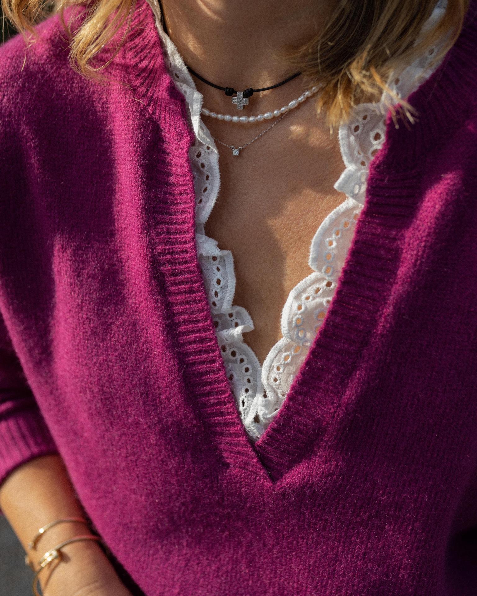 Jersey con cuello de pico y bordado con encaje