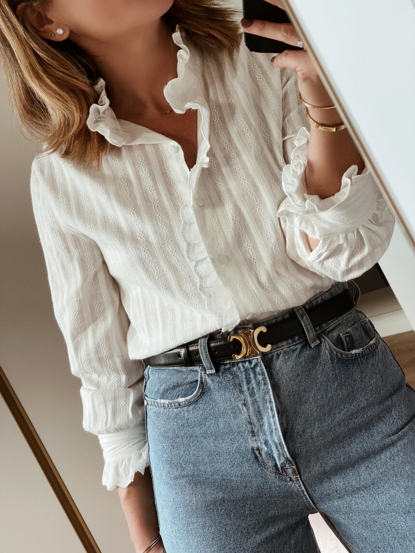 Blusa bordada con volantes en la parte delante, el cuello y los puños