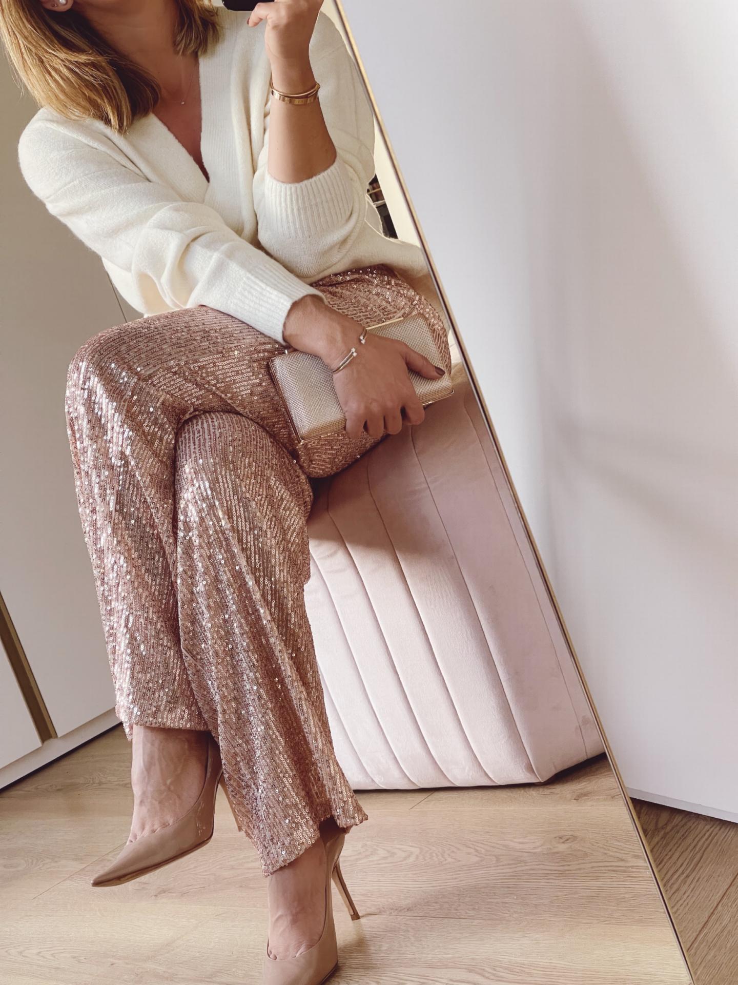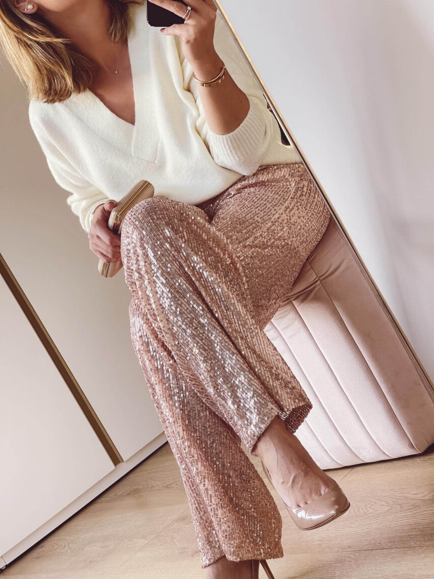 Pantalón de lentejuelas con forro tipo bermuda y goma en la cintura con pinza en los laterales y bolsillos.