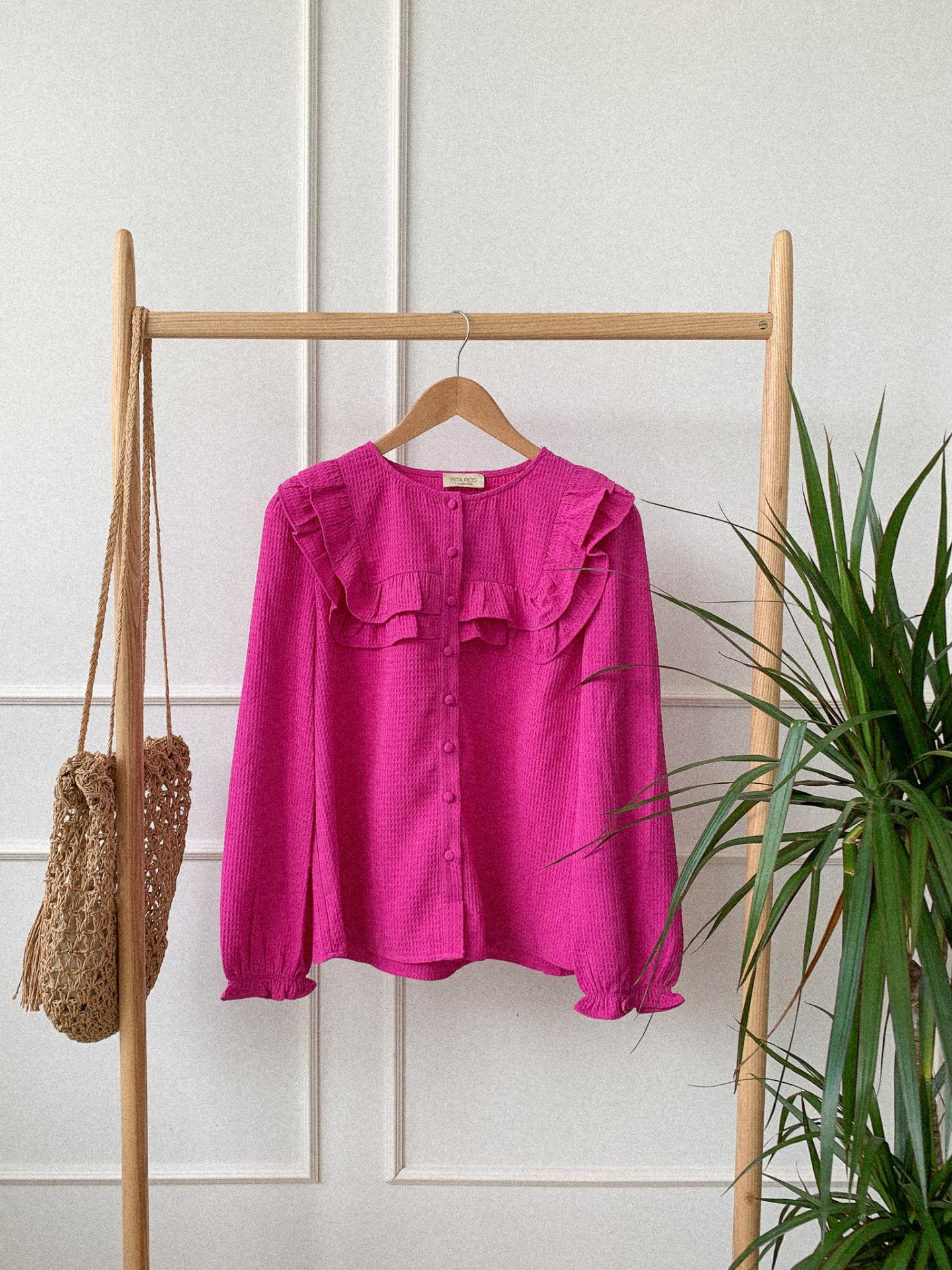 La modelo en la fotografia lleva el pecho de la blusa doblado simulando cuello de pico como sugerencia