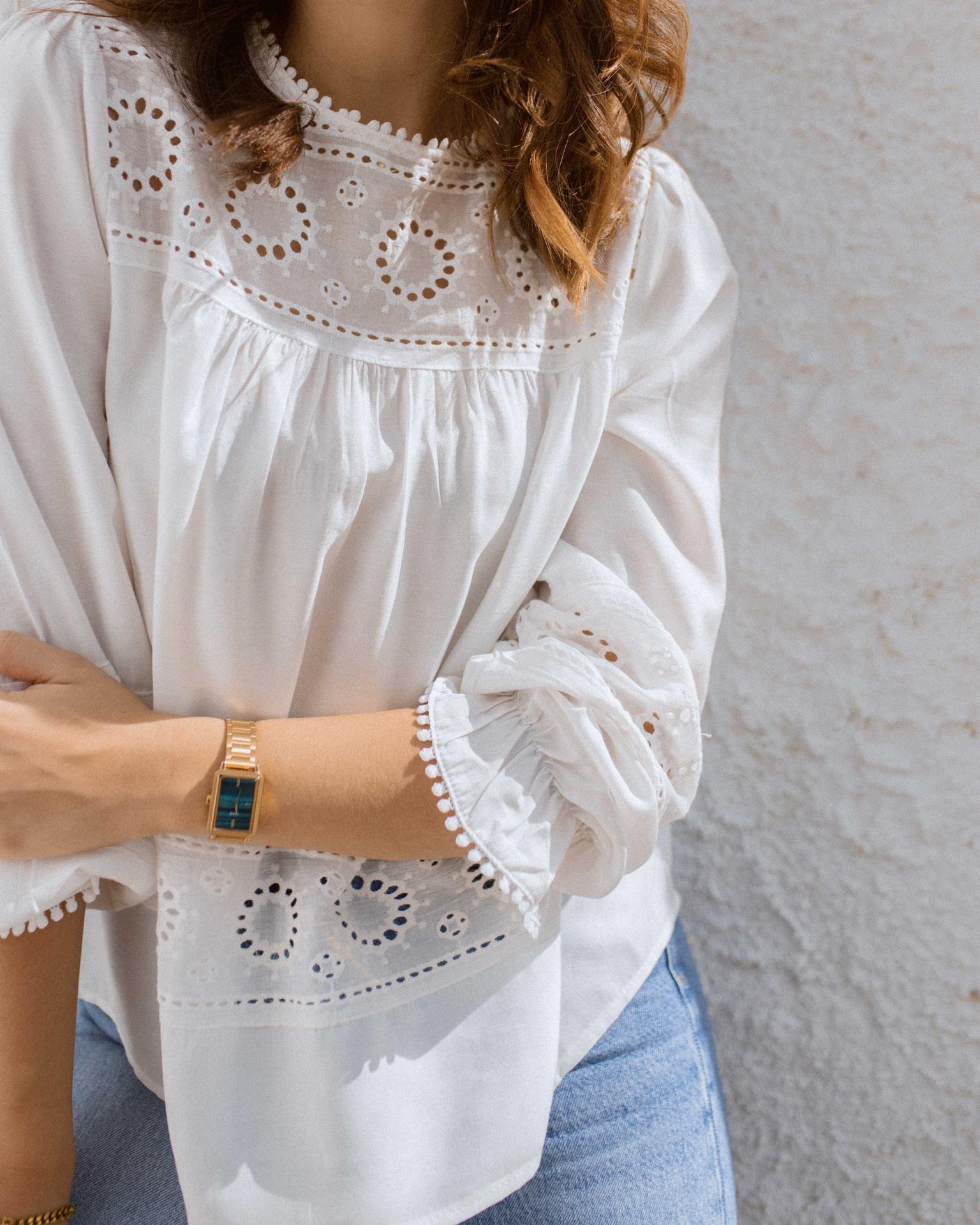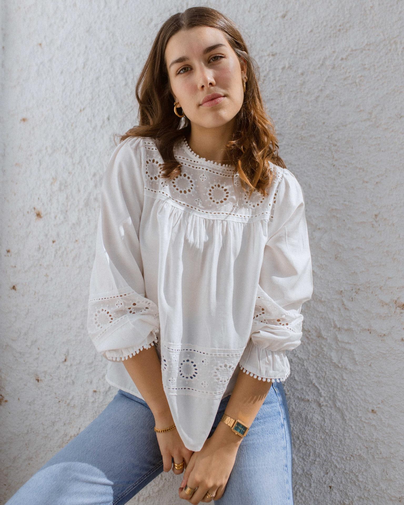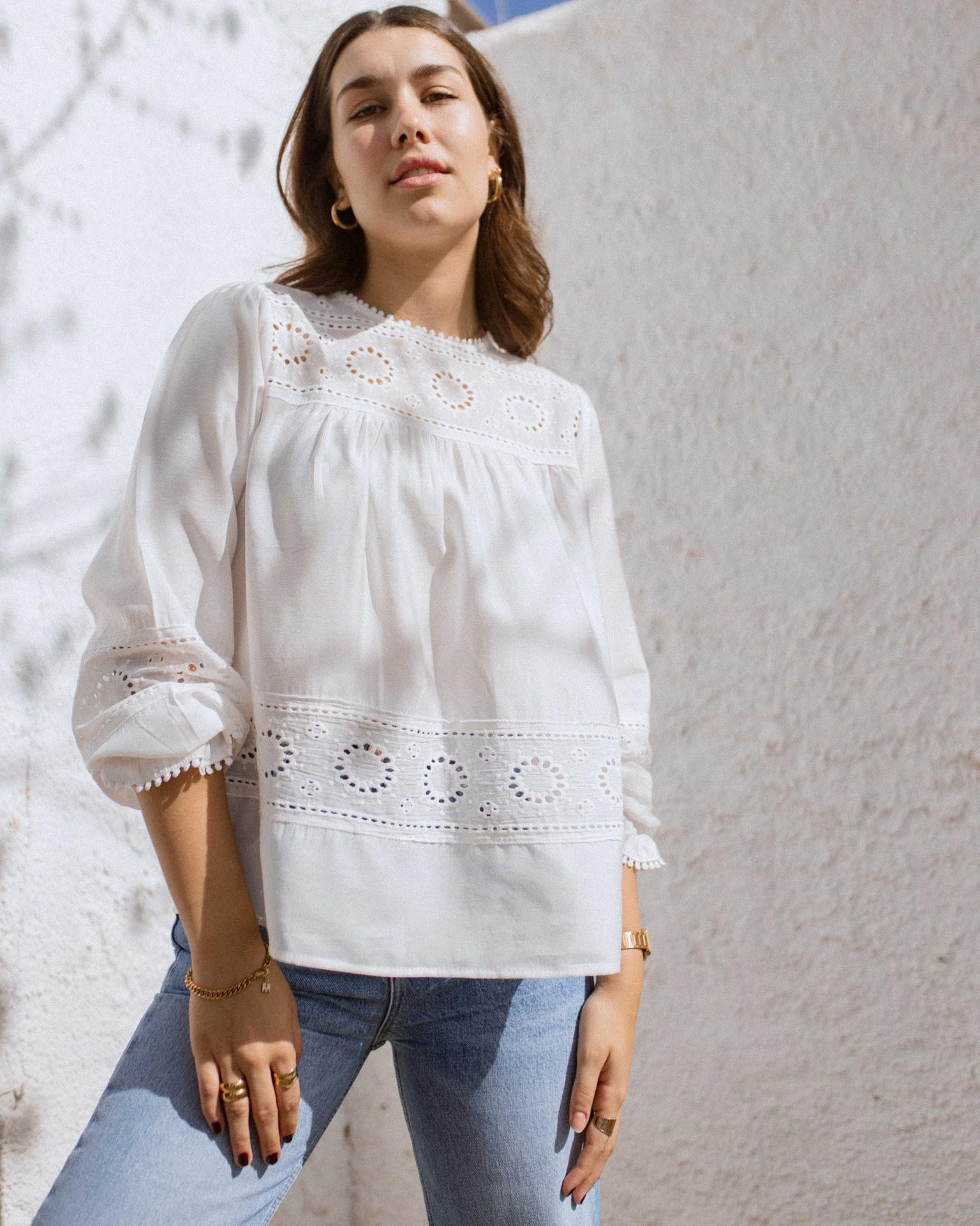 Camisa de cuello redondo y detalles bordados, puños fruncidos con acabados de puntilla y cierre trasero.