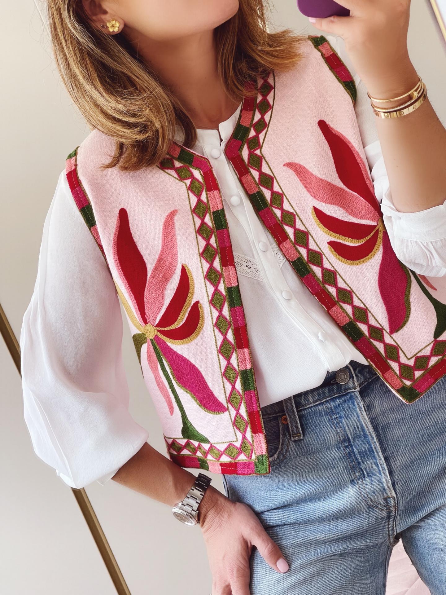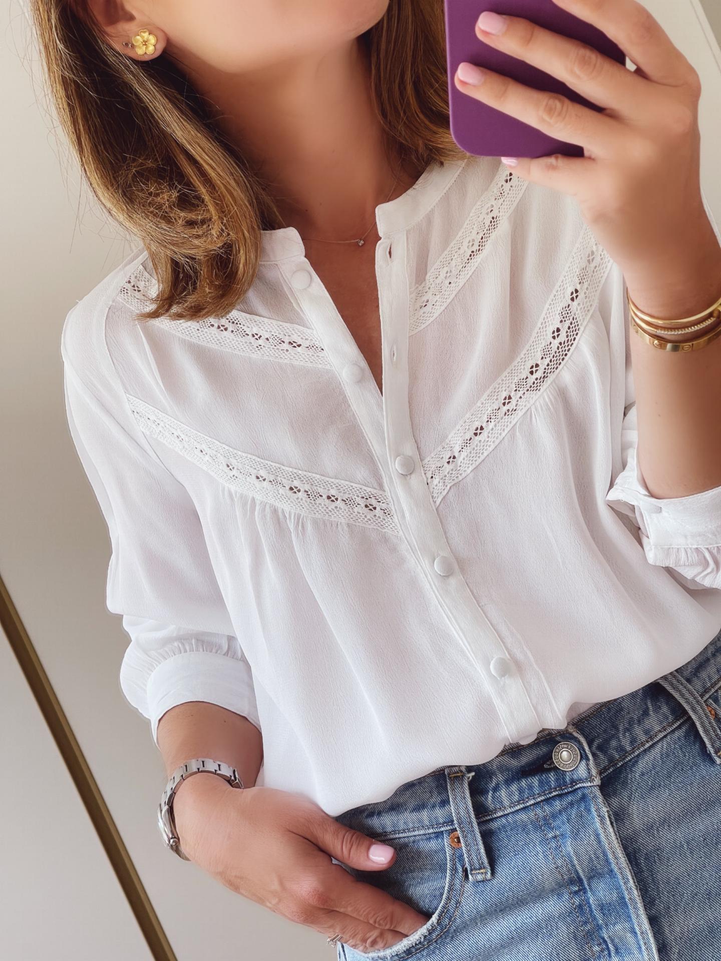 Camisa blanca con detalles de encaje en el pecho y botones forrados.