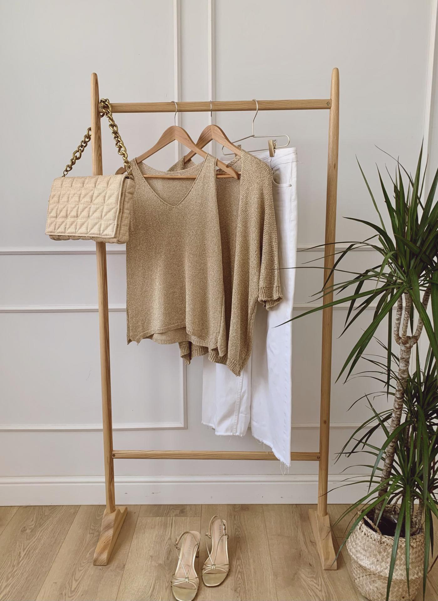 Conjunto chaqueta y top de punto con tejido lurex dorado