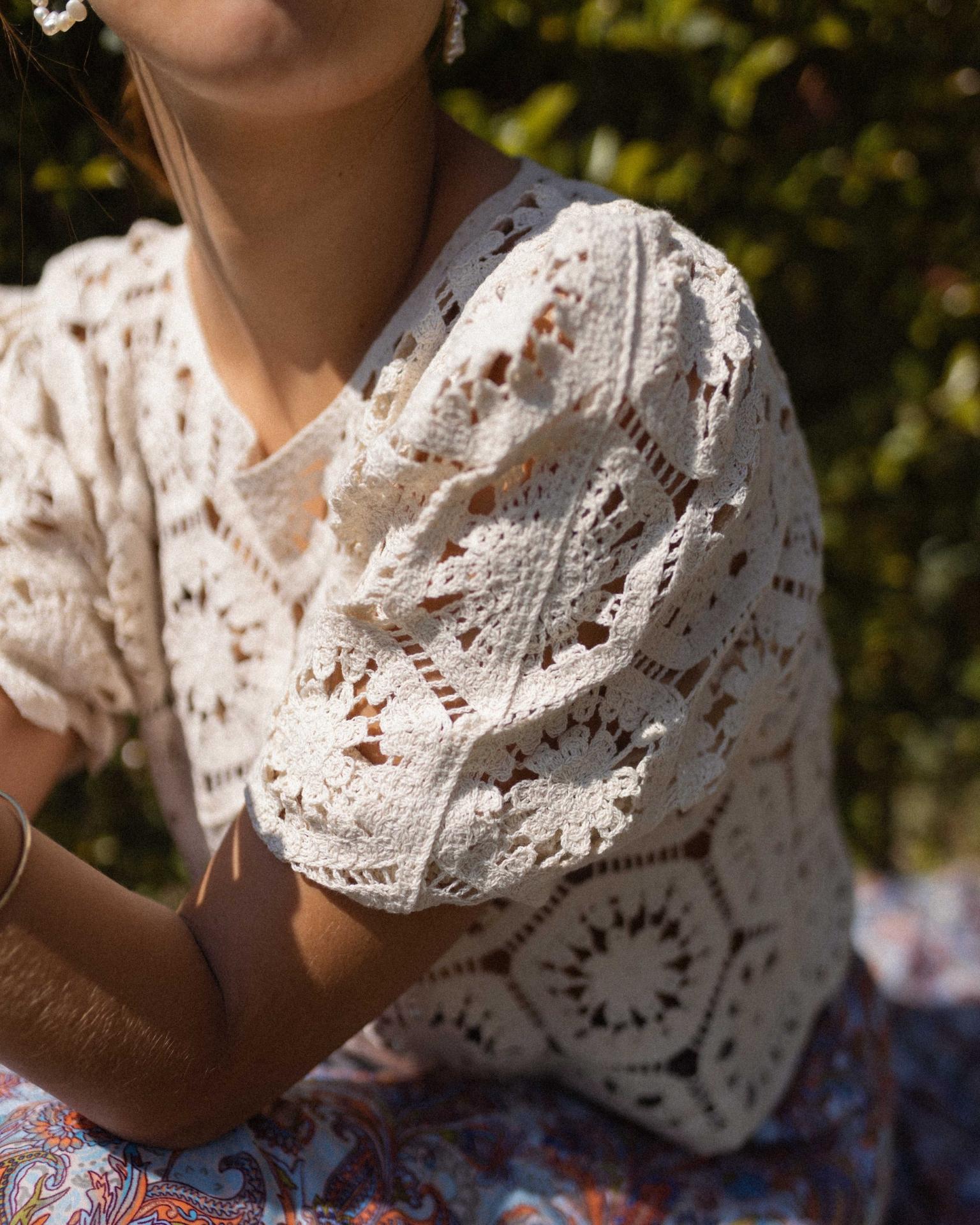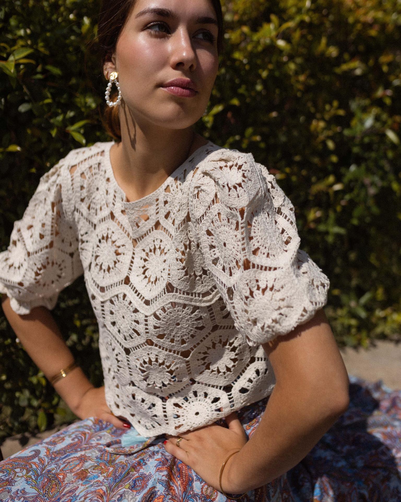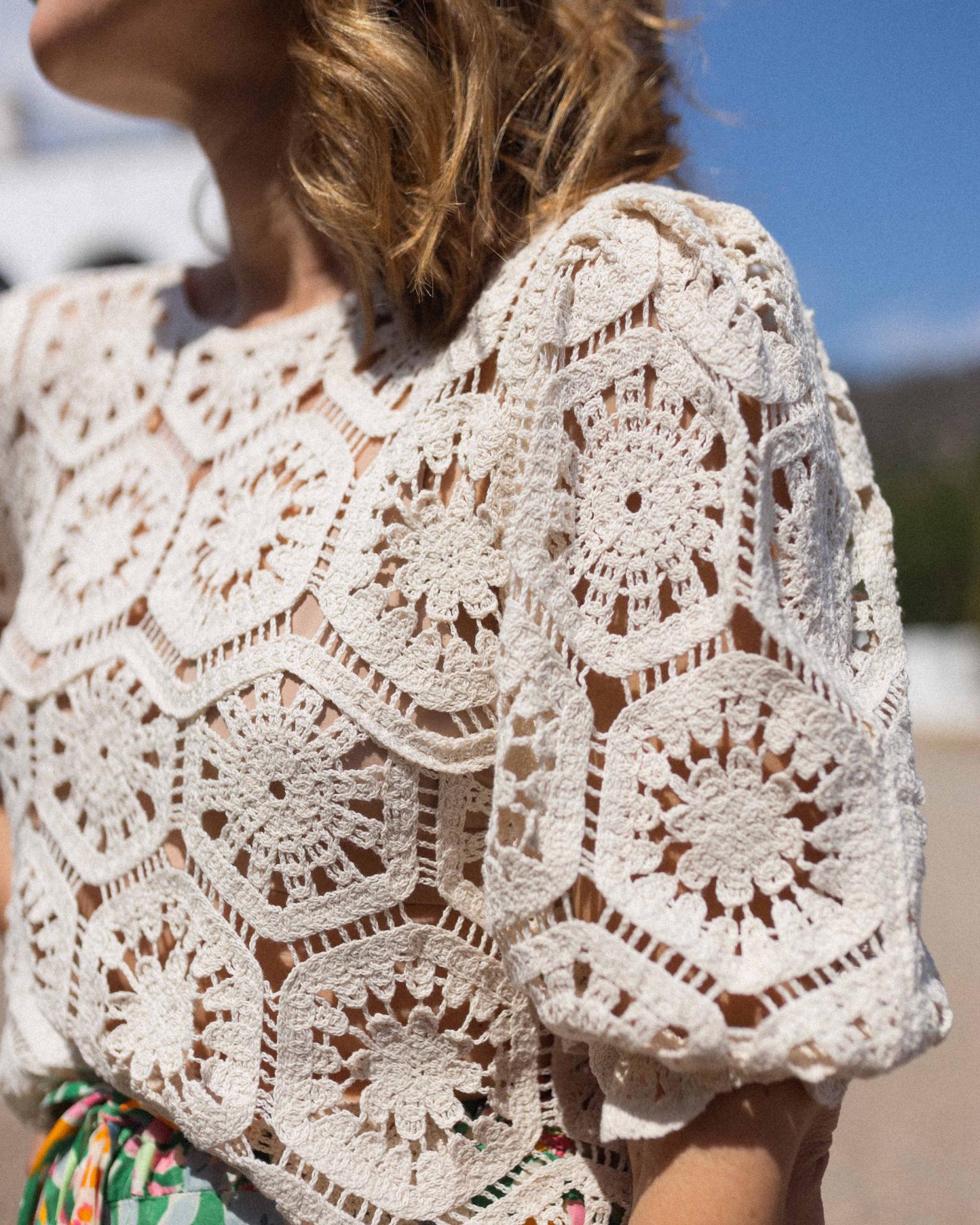 Top calado de corte recto, manga corta con goma y cuello redondo