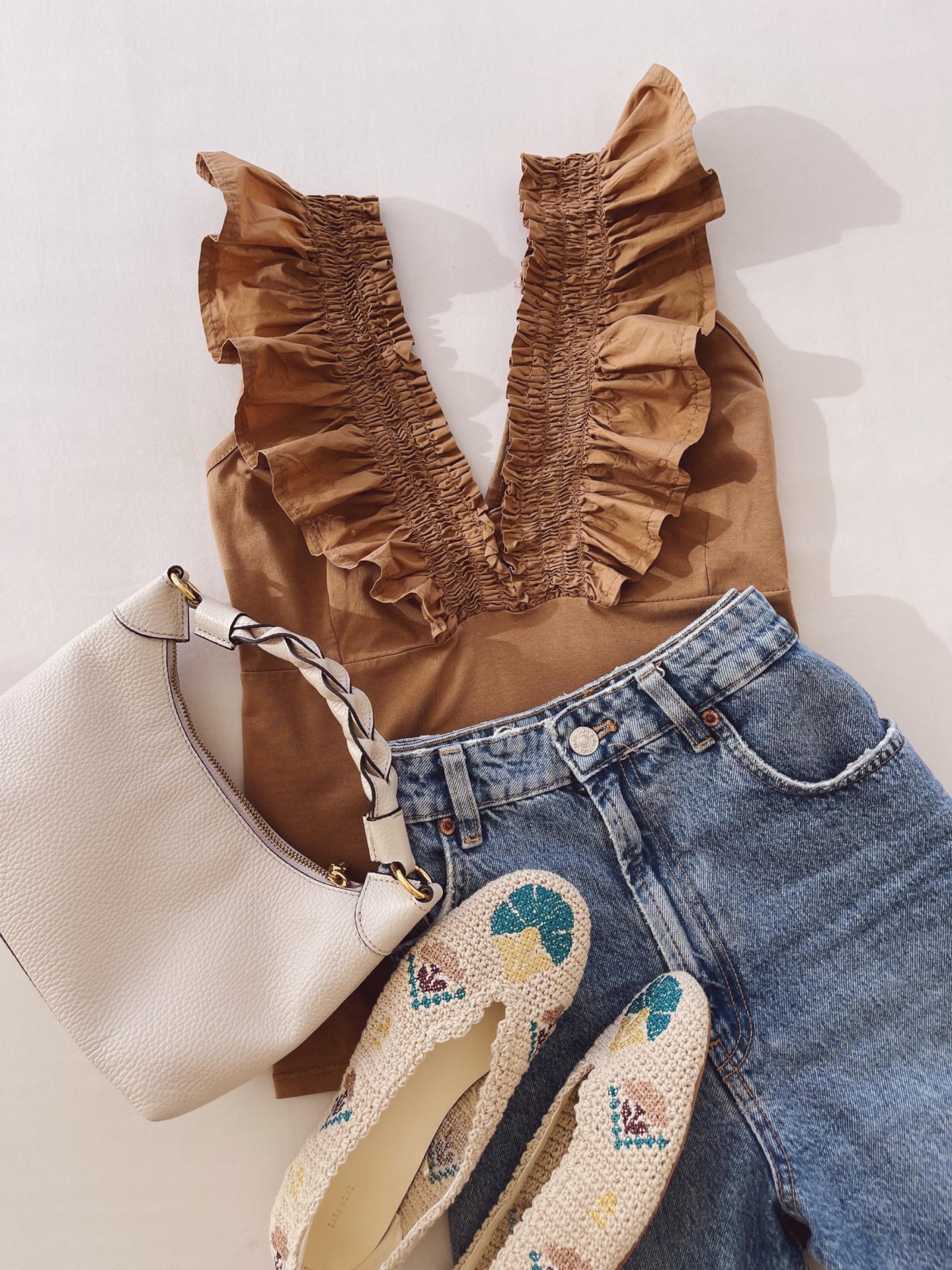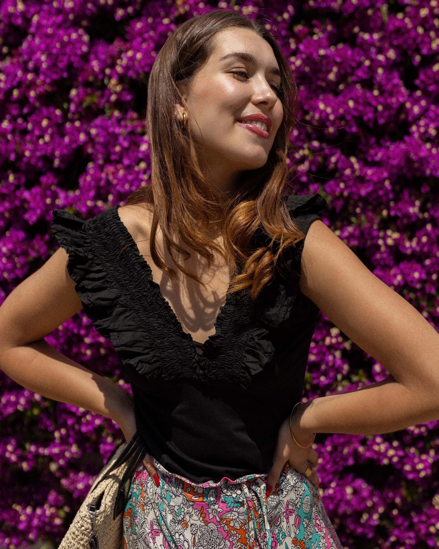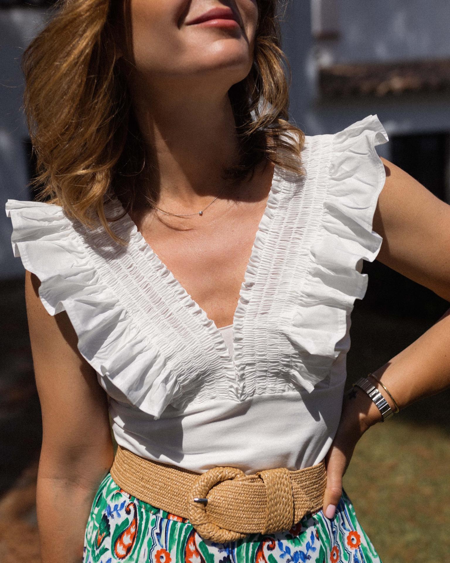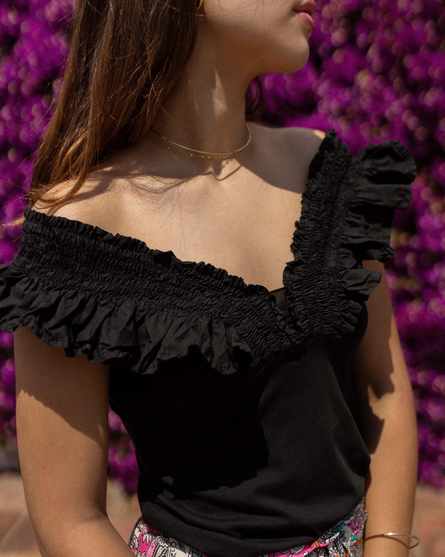 Top sin mangas liso con goma y volante en el escote.