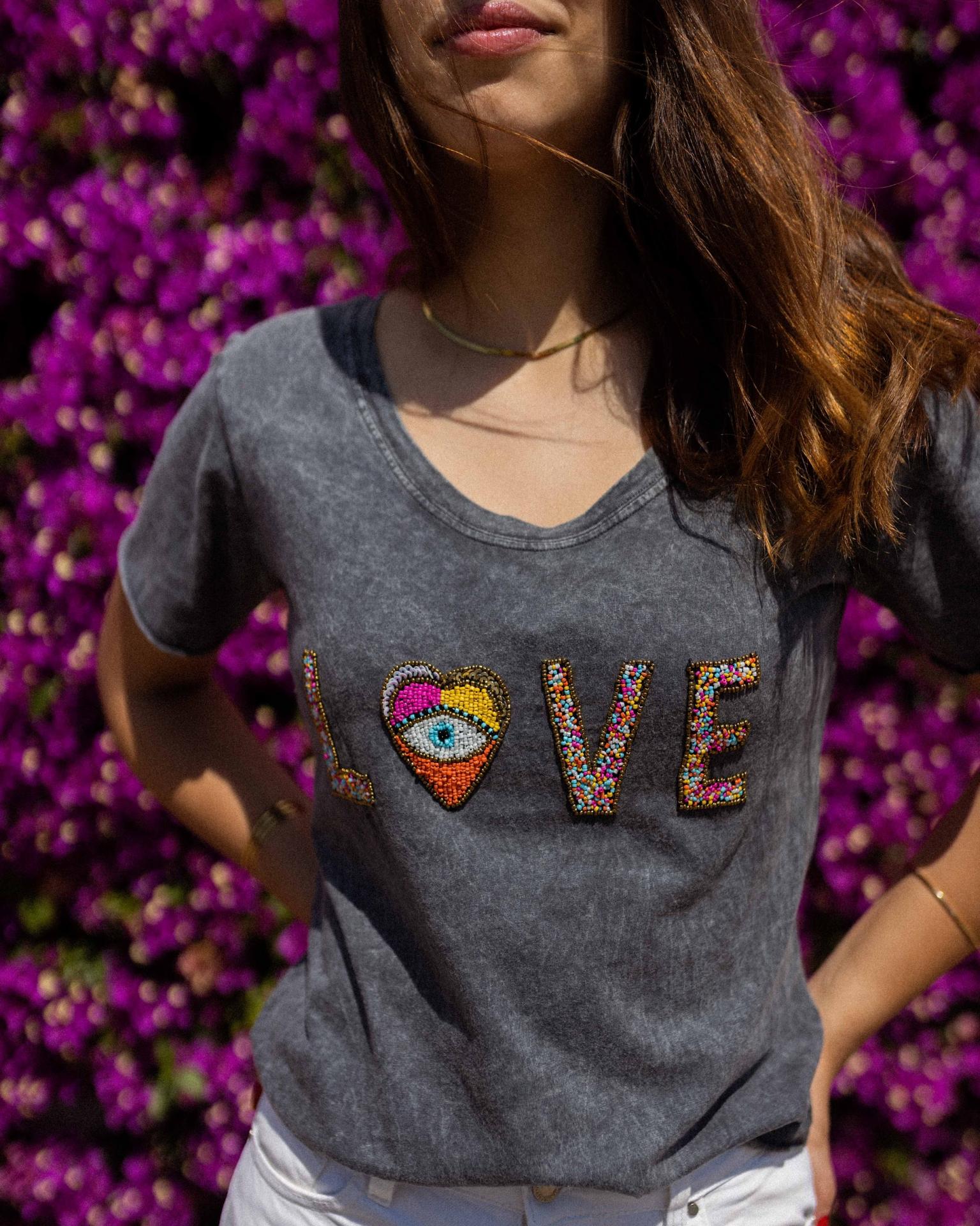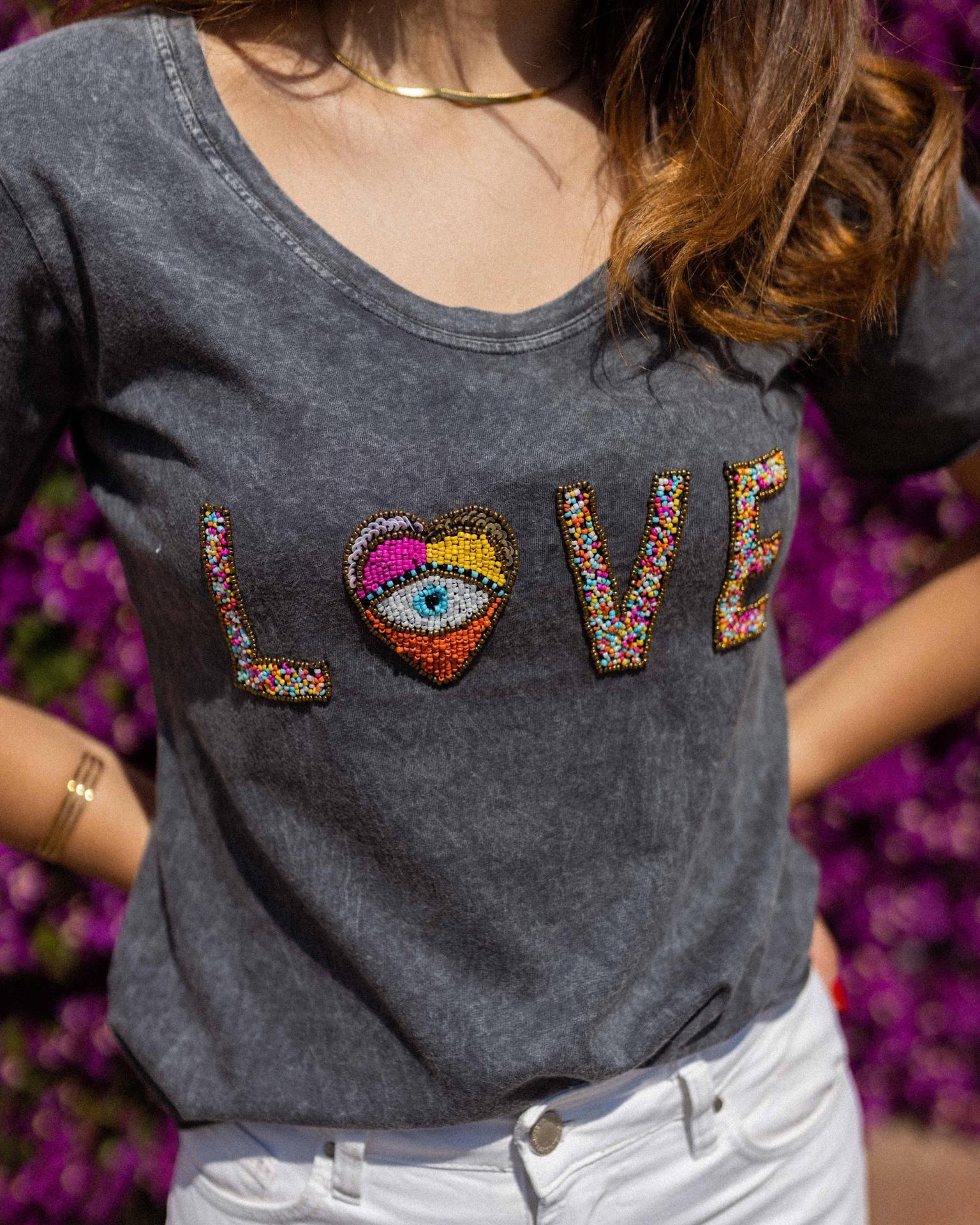 Camiseta de manga corta y cuello redondo con la palabra LOVE bordada con abalorios de colores.