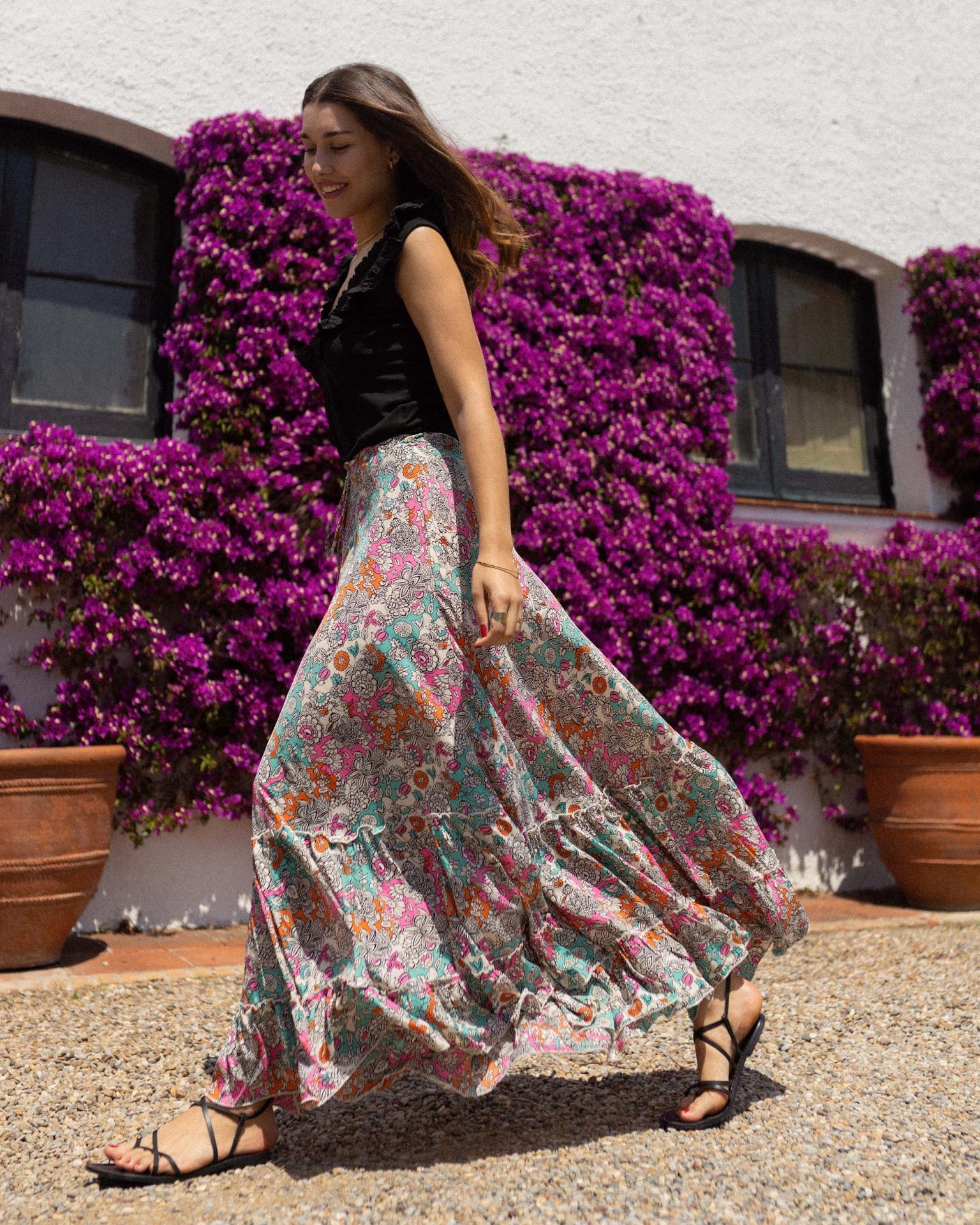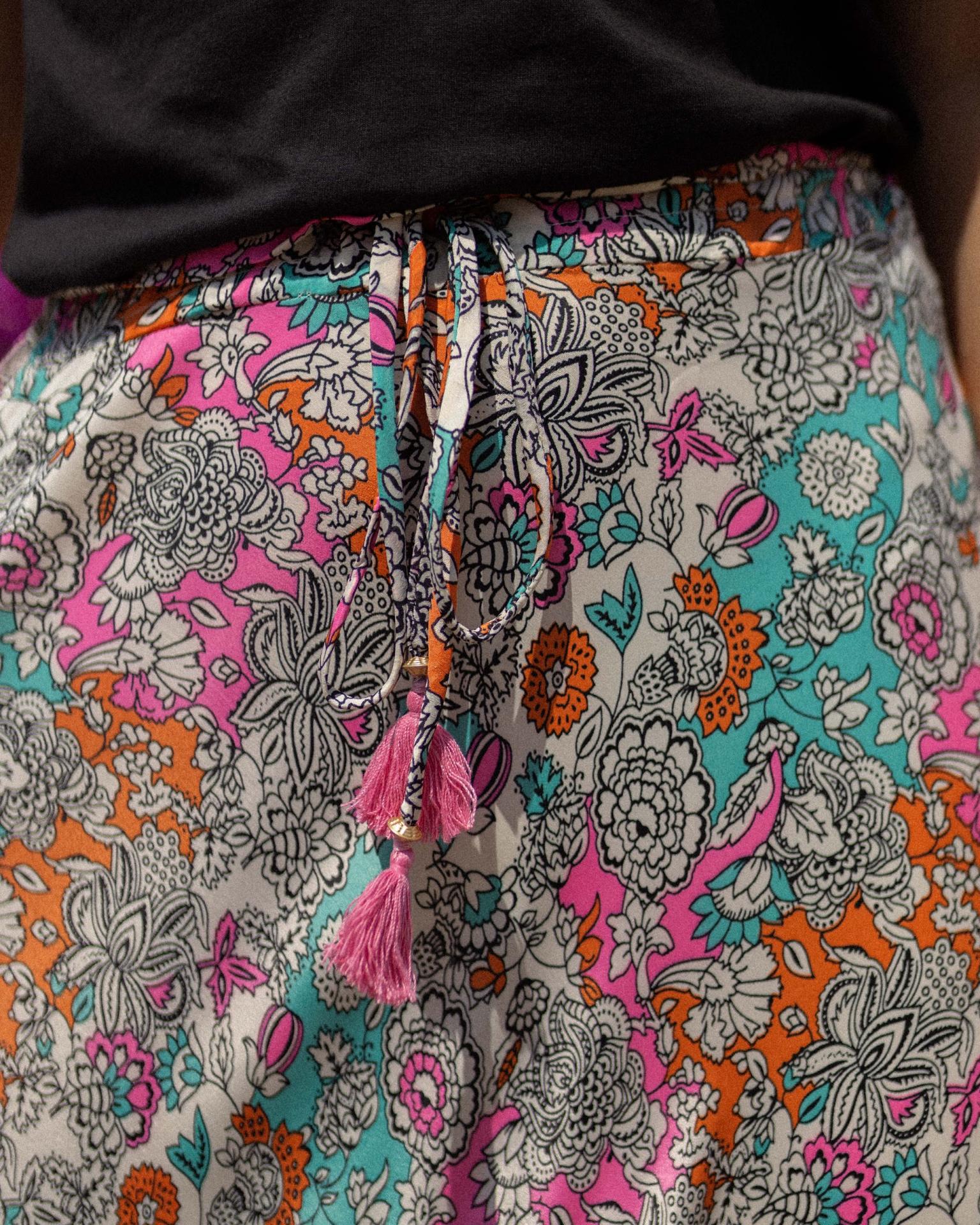 Falda larga de estampado floral con cordón y goma en la cintura. Corte ligeramente acampanado.