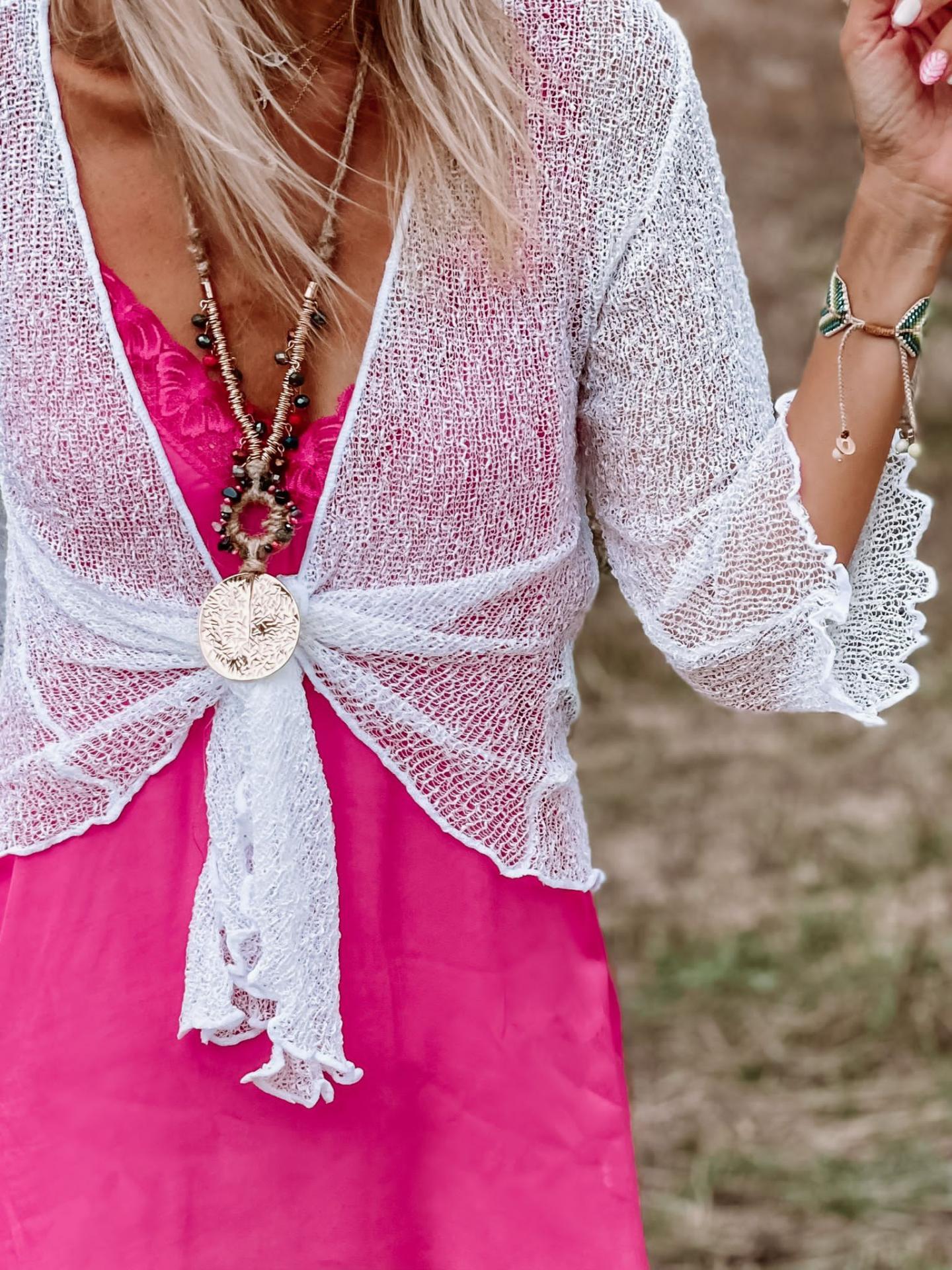 Chaqueta fina calada ideal para llevarla abierta o con un nudo.
