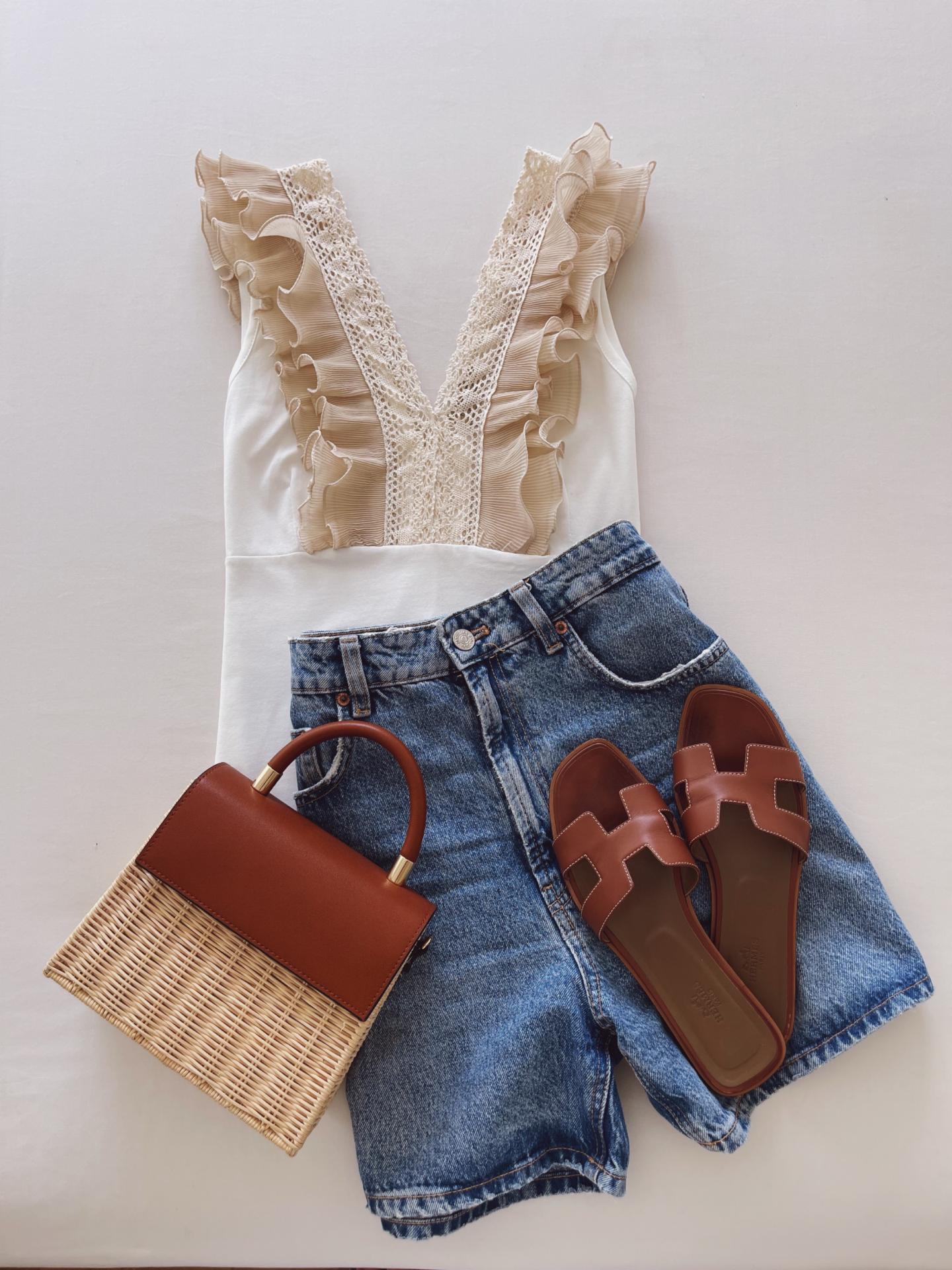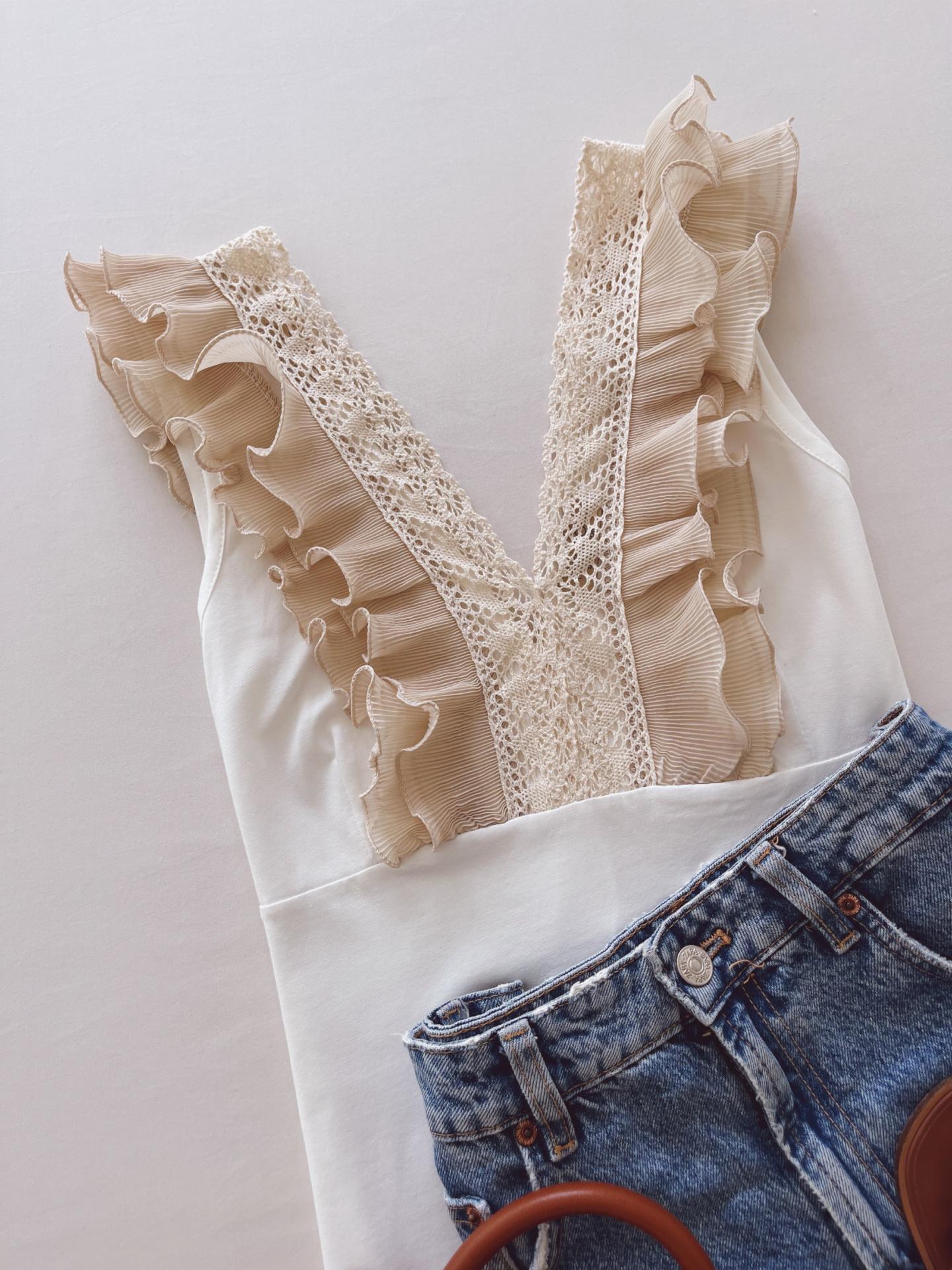 Top sin mangas con volantes y detalles de encaje en el escote. Precioso cuello en V.