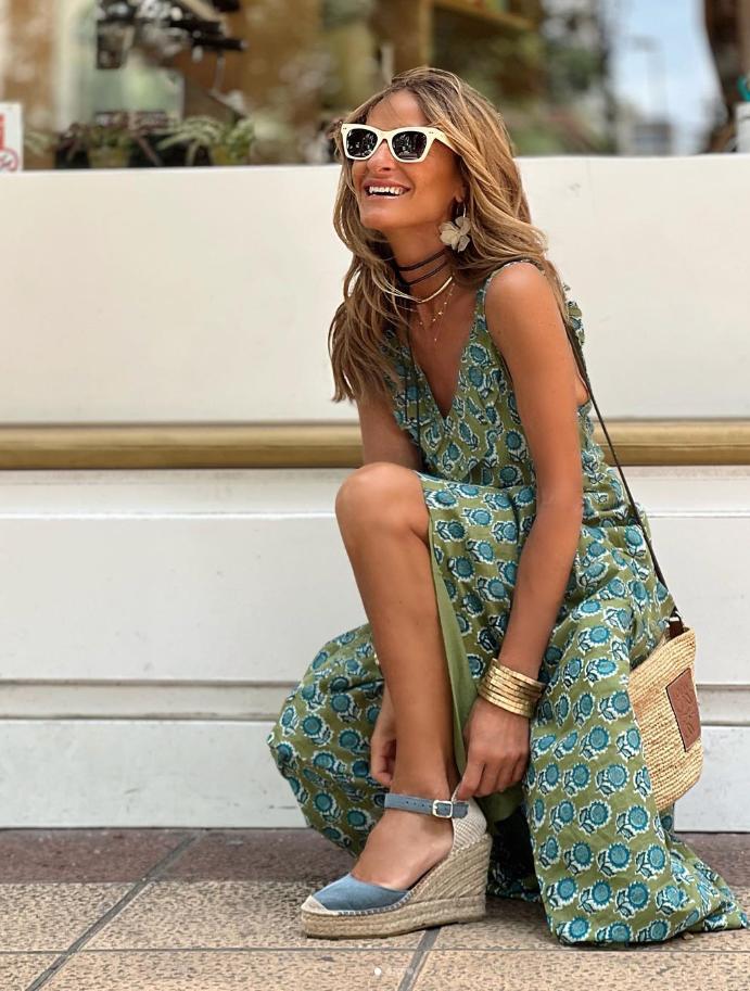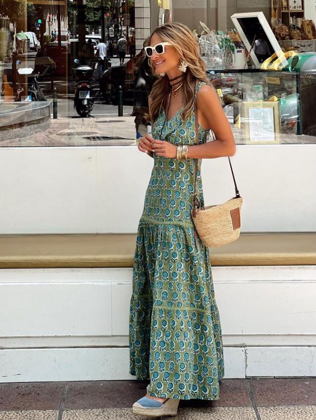 Vestido largo vaporoso con estampado de flores con cuello y espalda de pico. Lleva forro.