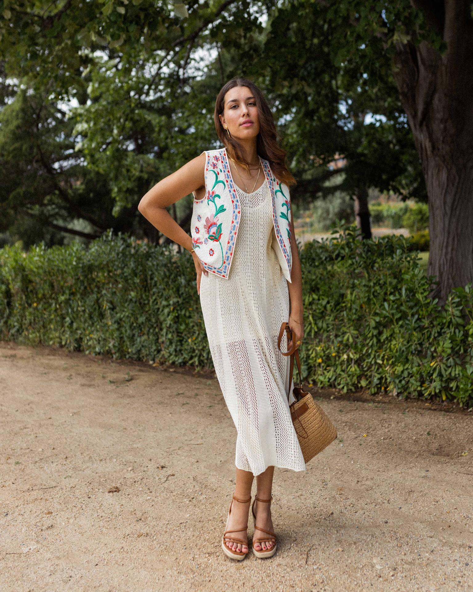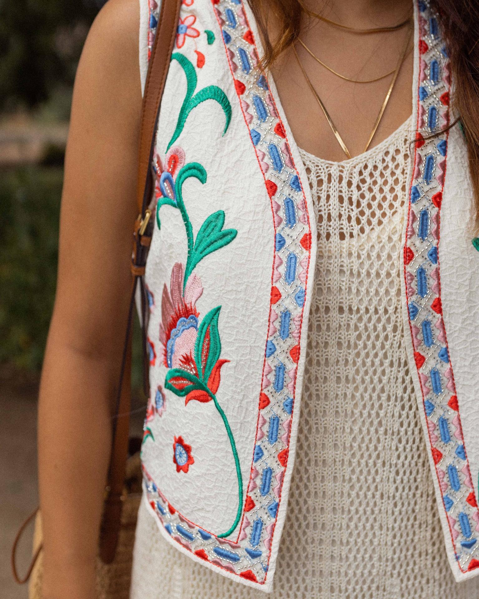 Chaleco con detalles florales bordados y abalorios plateados. Cierre con corchete.