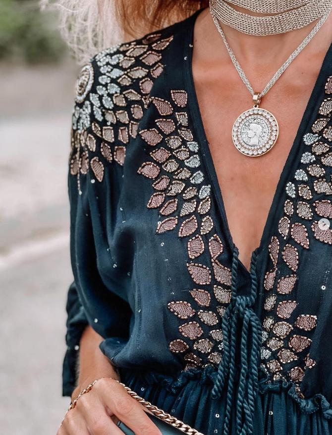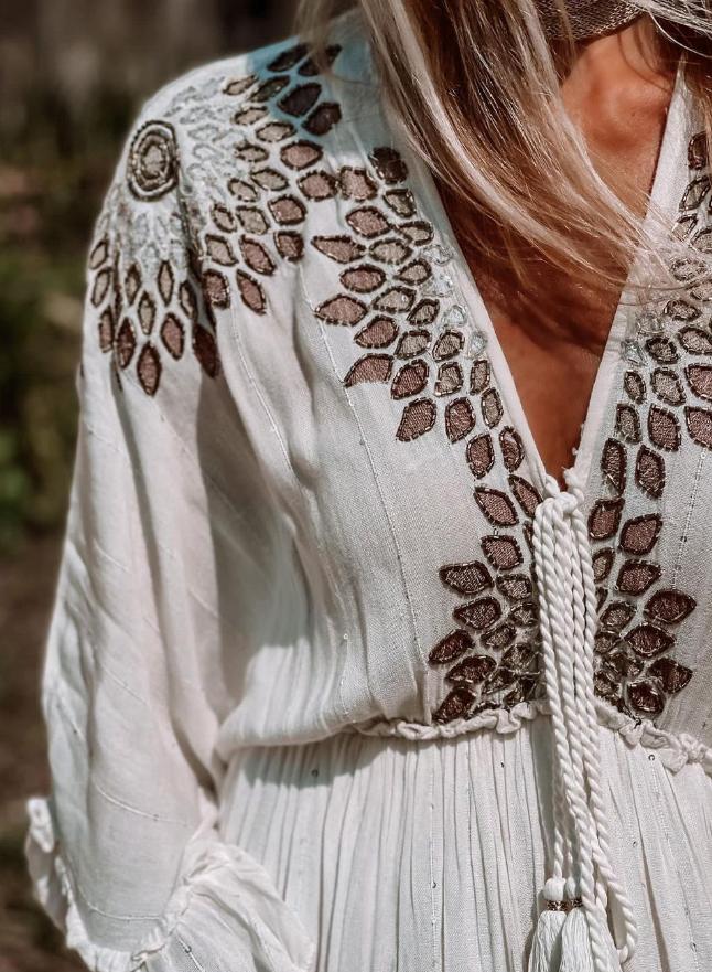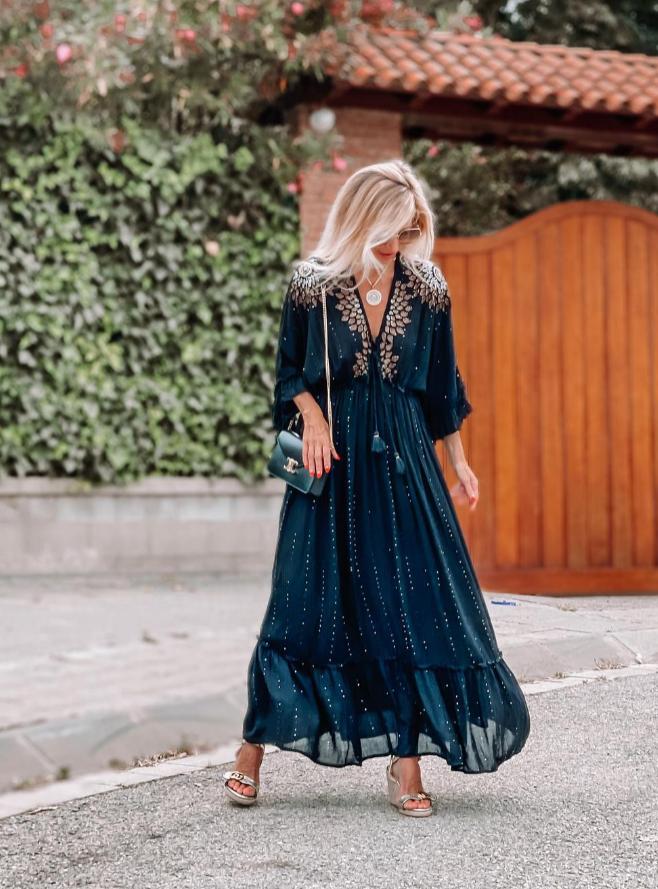 Vestido largo vaporoso con cuello y espalda en V y detalles con abalorios. Lleva forro.