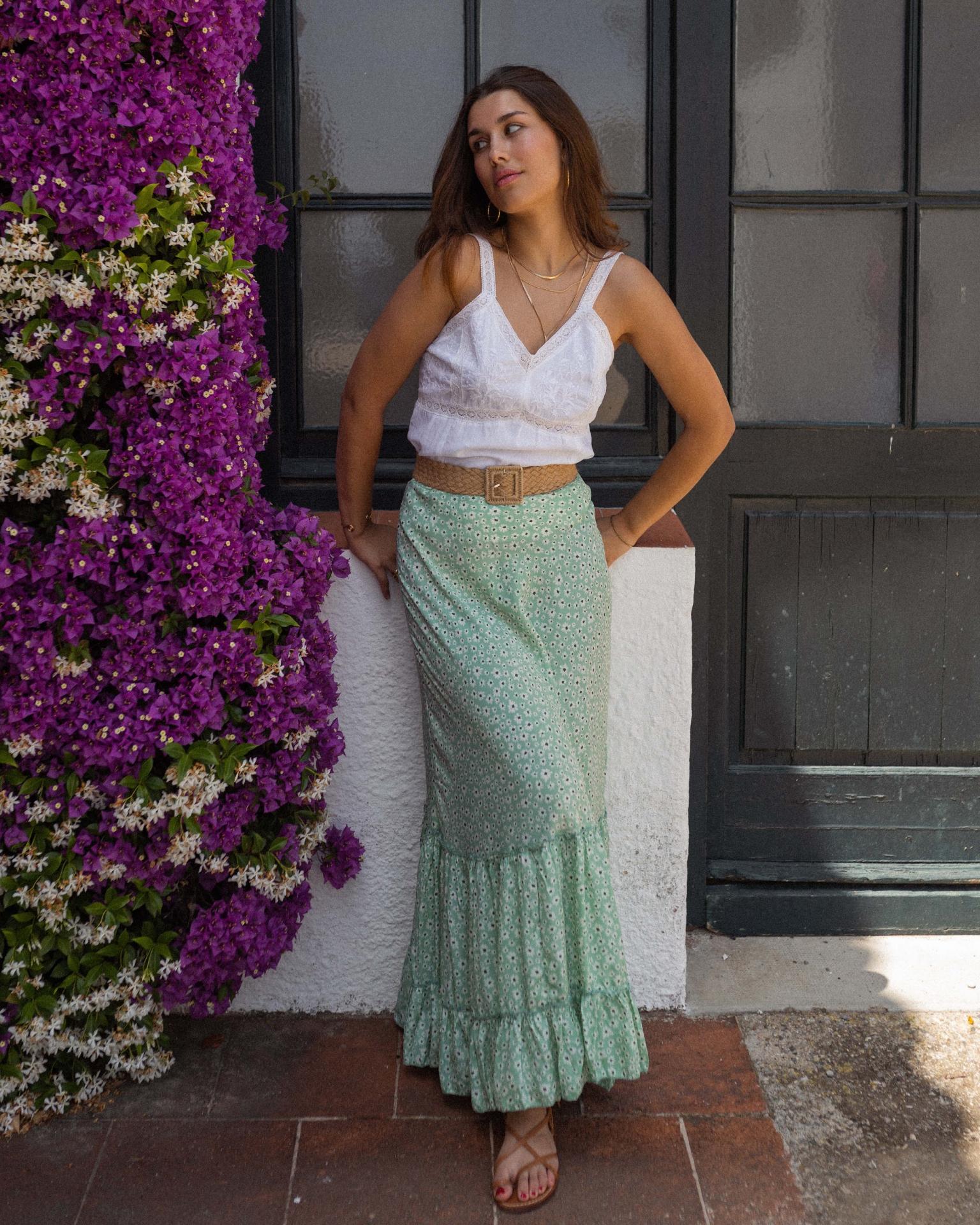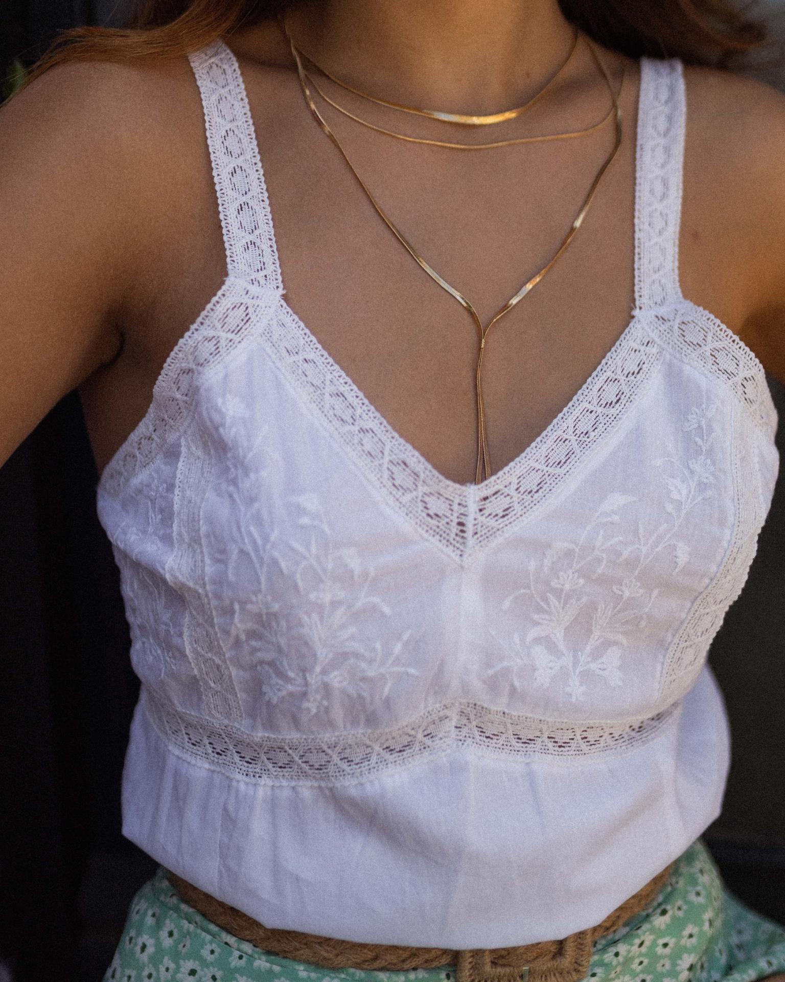 Top de tirantes con detalles bordados y de encaje. Lleva nido de abeja en la espalda.