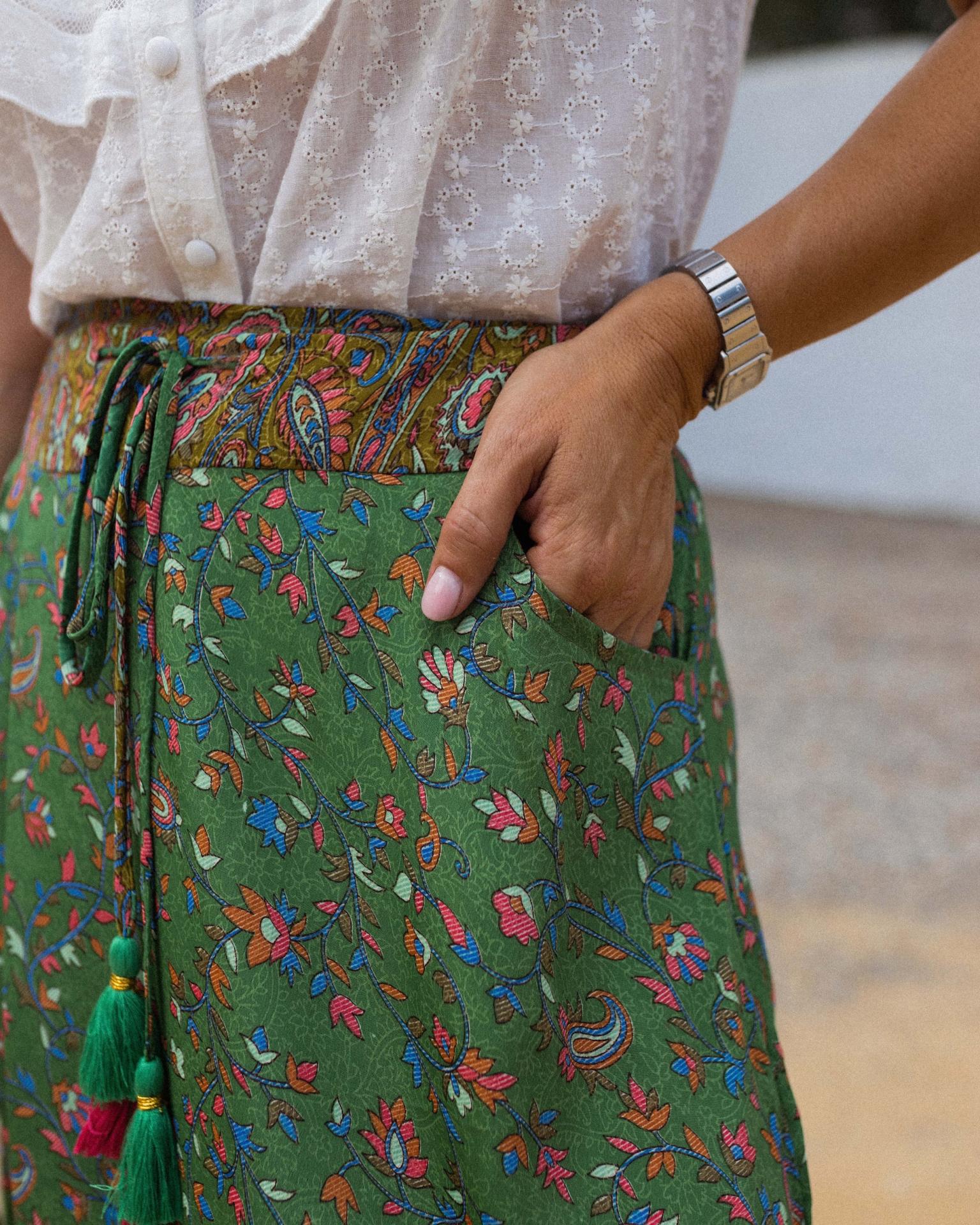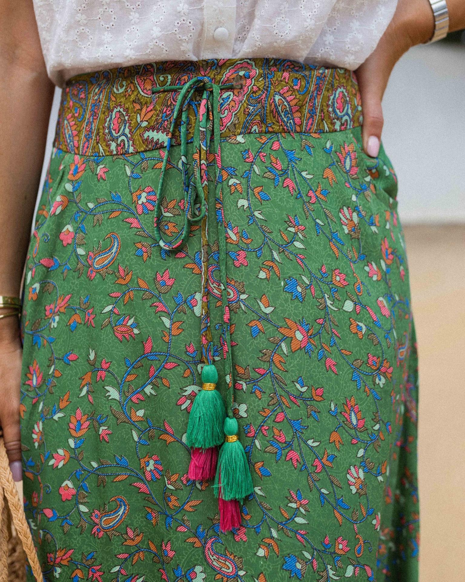 Falda larga con estampado floral, bolsillos laterales y goma en la parte trasera de la cintura