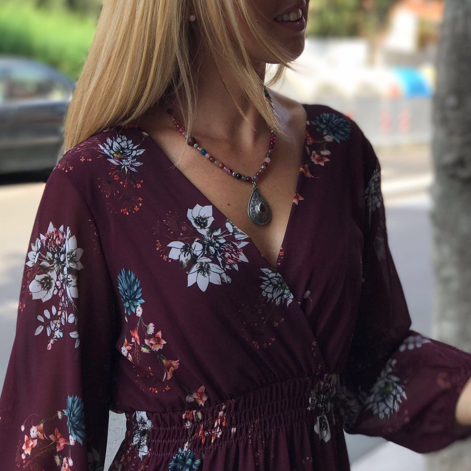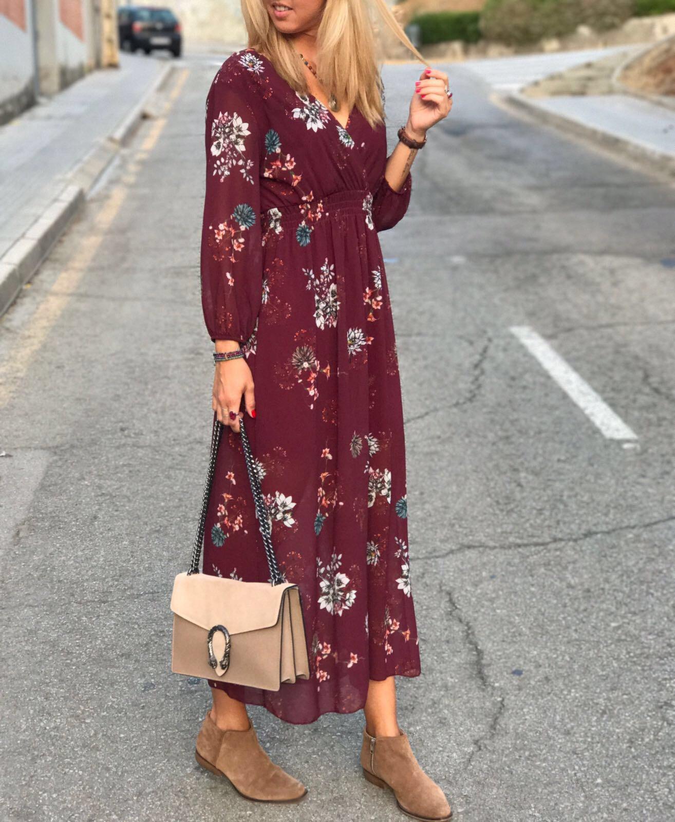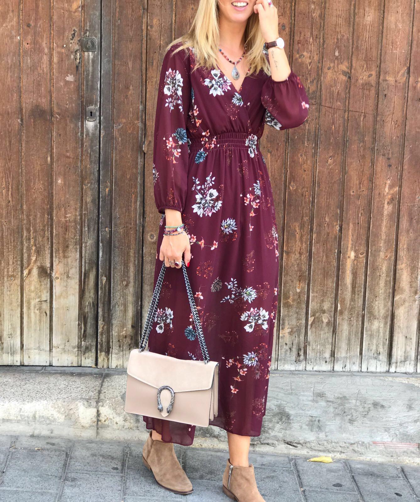 Precioso vestido largo con un estampado de flores muy bonito sobre fondo burdeos, ideal para empezar el otoño.