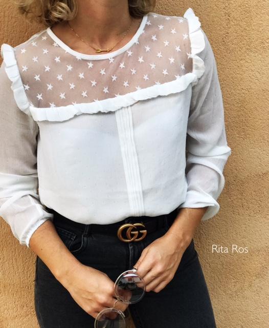 Preciosa blusa combinada en gasa y plumeti con encaje de estrellas.