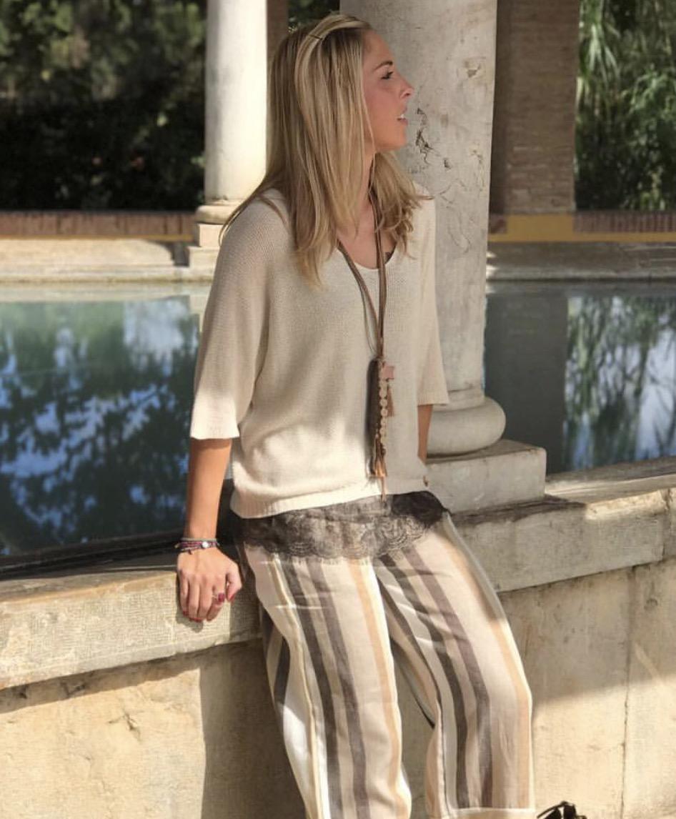 Precioso jersey de punto en color beige, manga tres cuartos y cuello de pico.