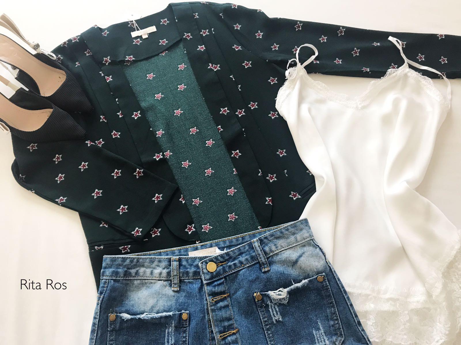 Preciosa americana con estampado de estrellitas sobre fondo verde botella.