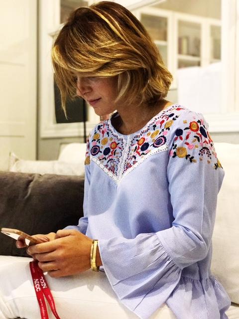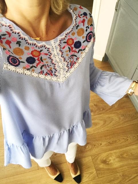 Nueva blusa milrayas color azul, con un bordado en escote y hombros precioso.