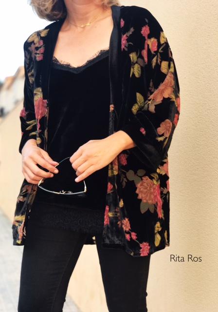 Una preciosidad de kimono todo de terciopelo con flores de gasa.