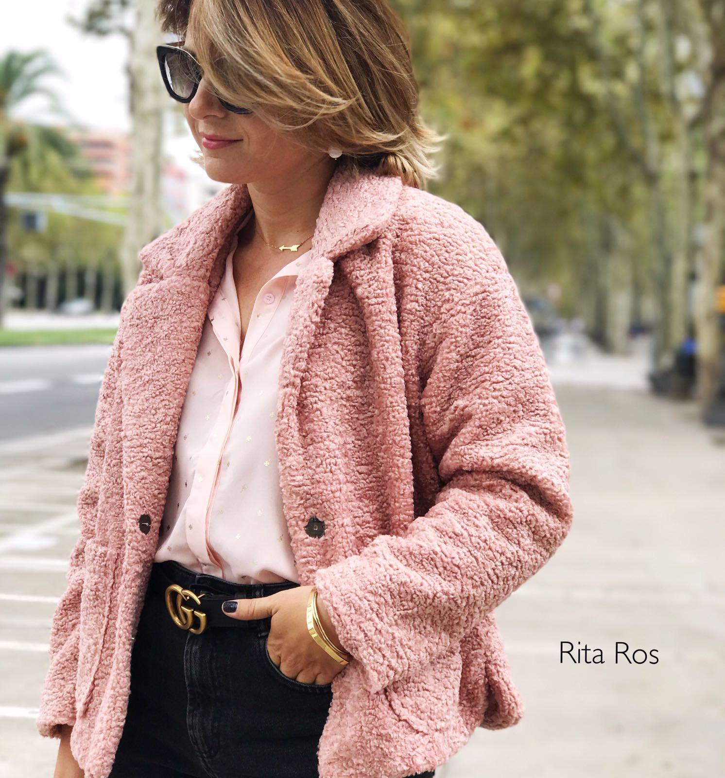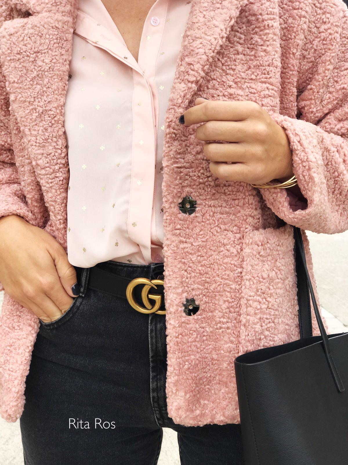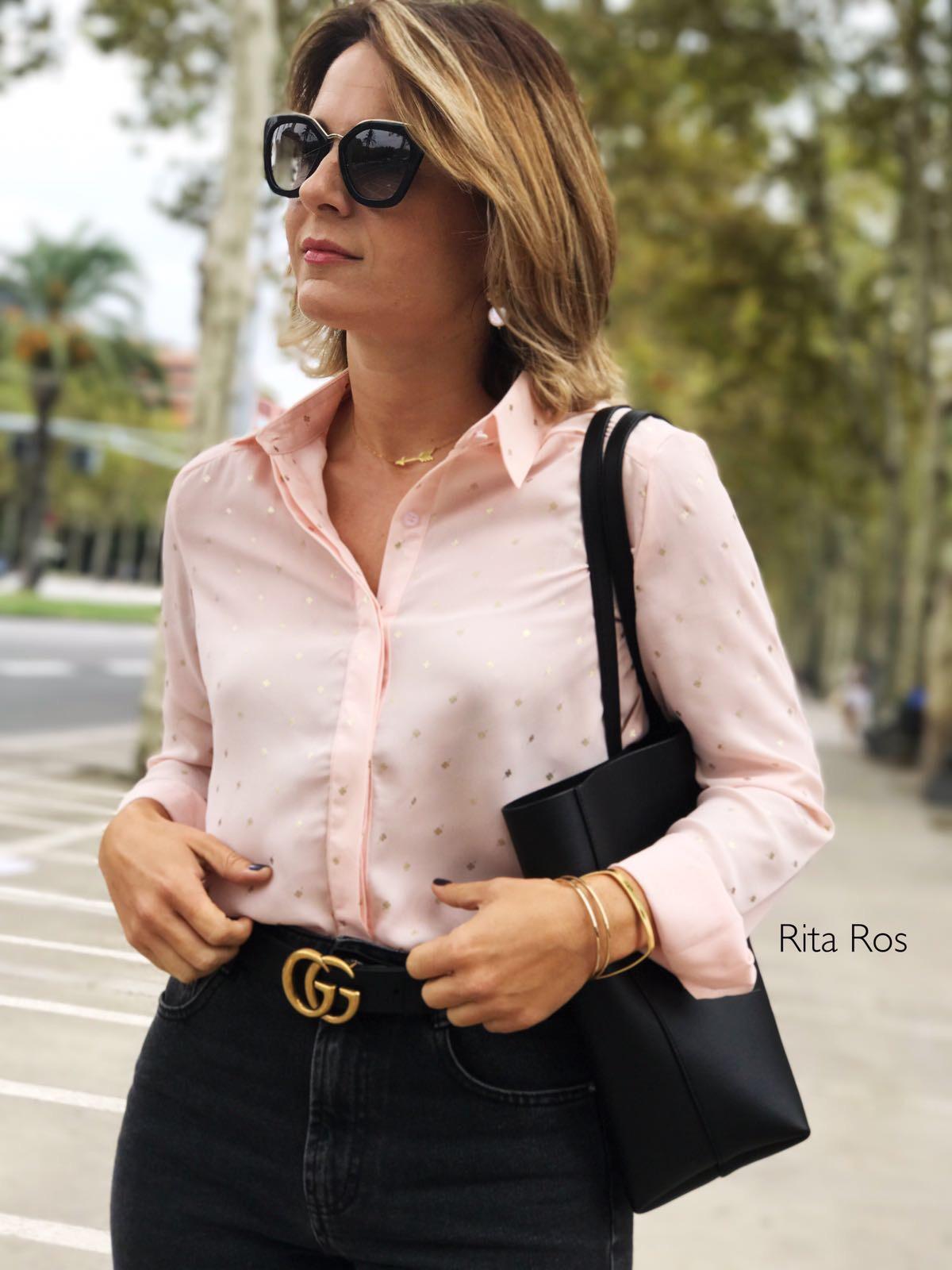 Preciosa blusa de gasa en color rosa palo con un estampado de tréboles en color dorado que enamora.
