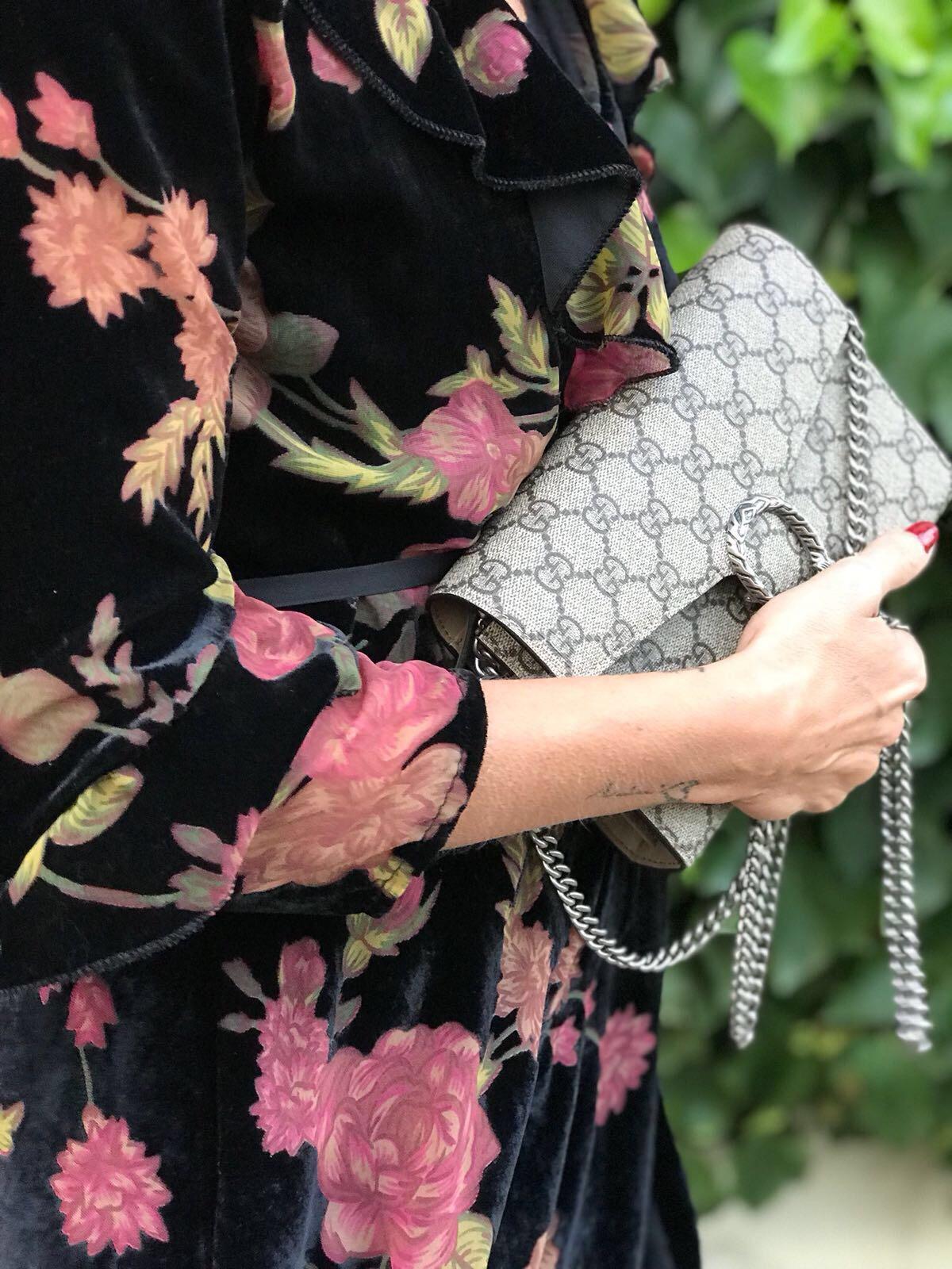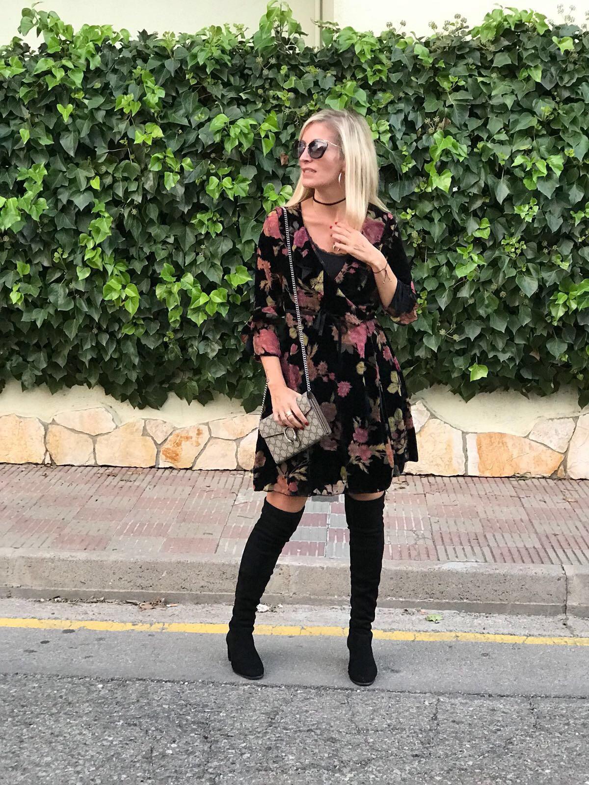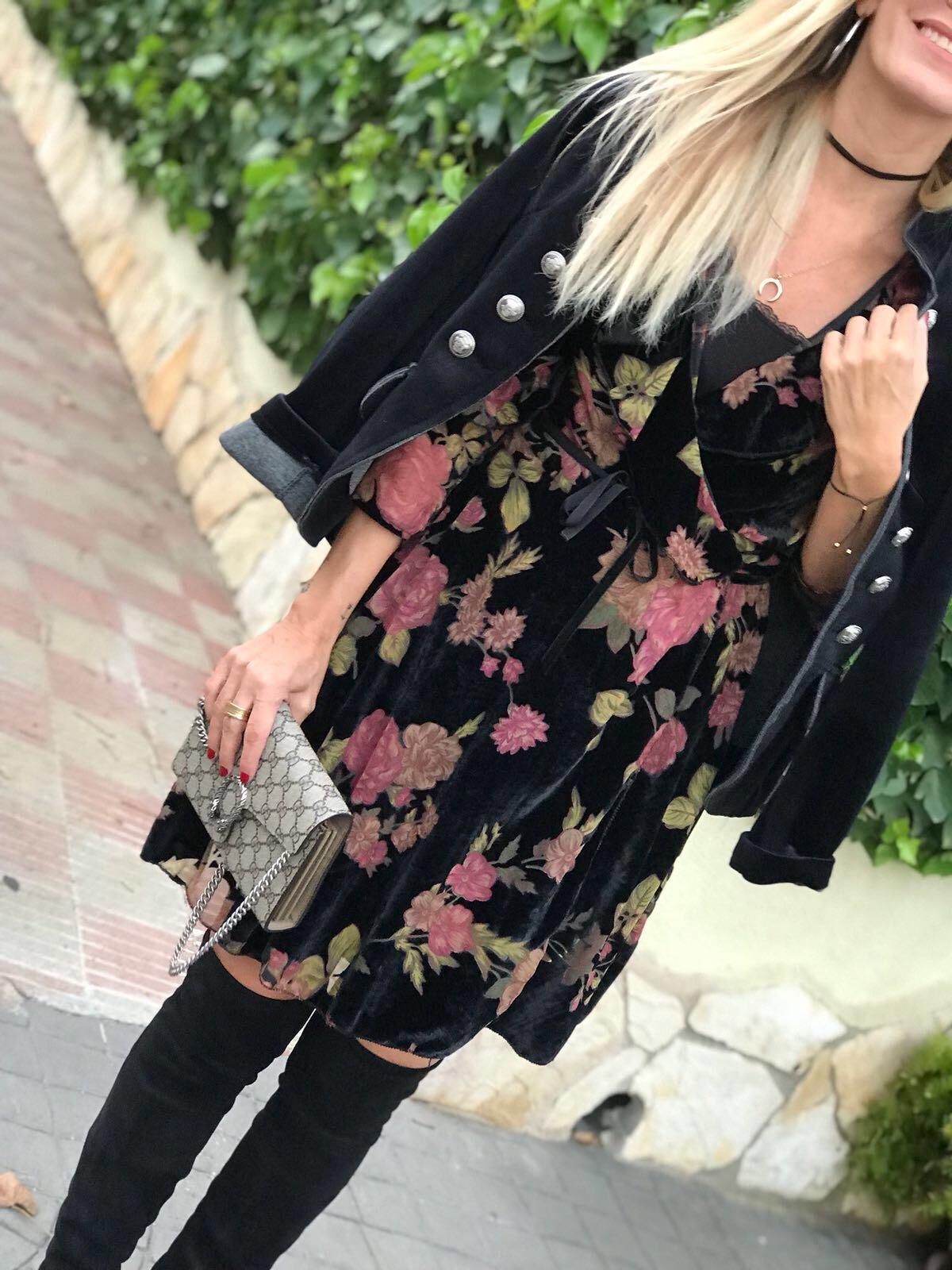 Precioso vestido corto en terciopelo, con un estampado de flores que enamora. Manga larga y escote cruzado.