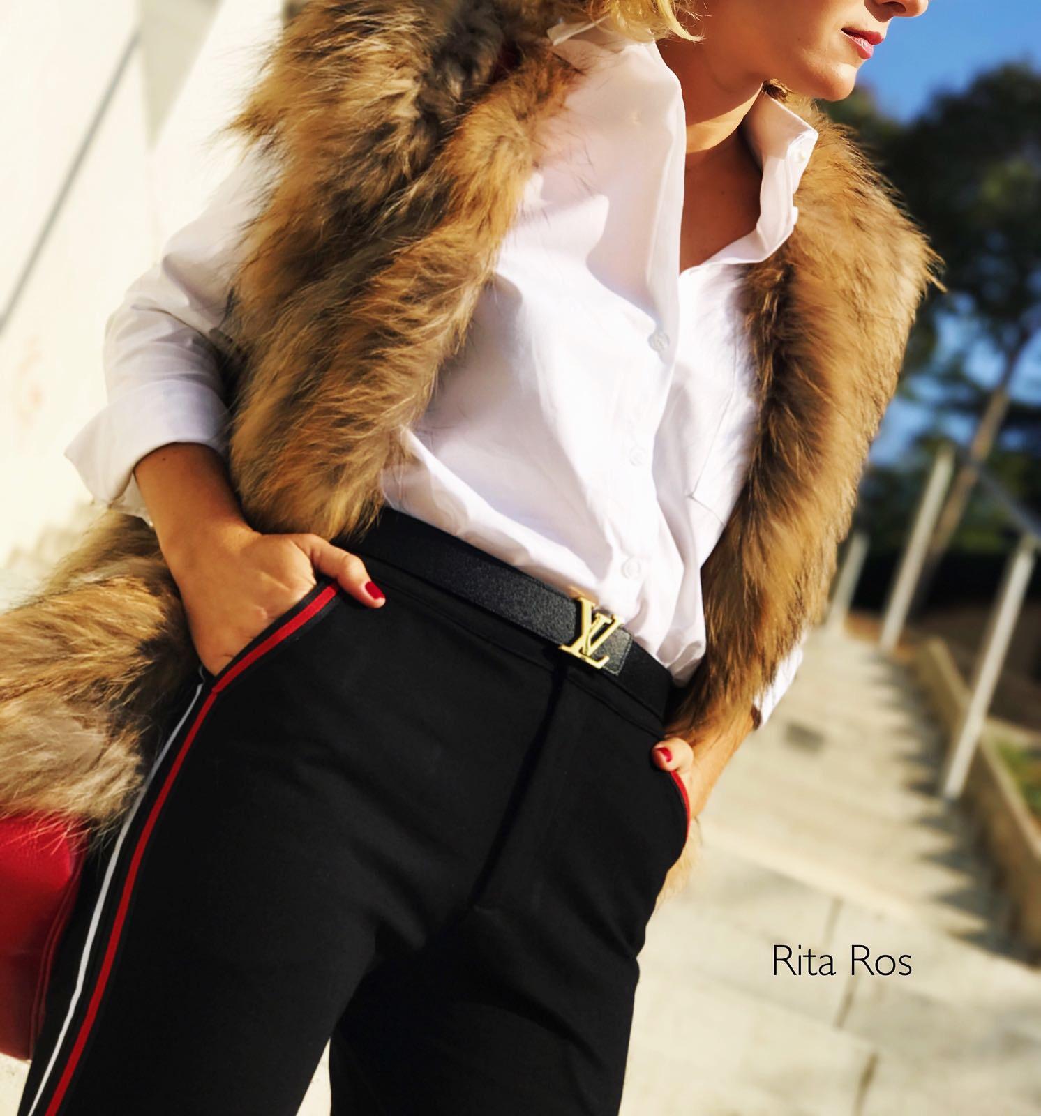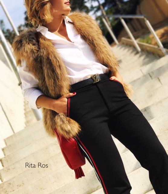Precioso pantalón negro con rayas laterales en rojo y blanco, súper favorecedor. El efecto de las franjas alarga las piernas y estiliza la figura.