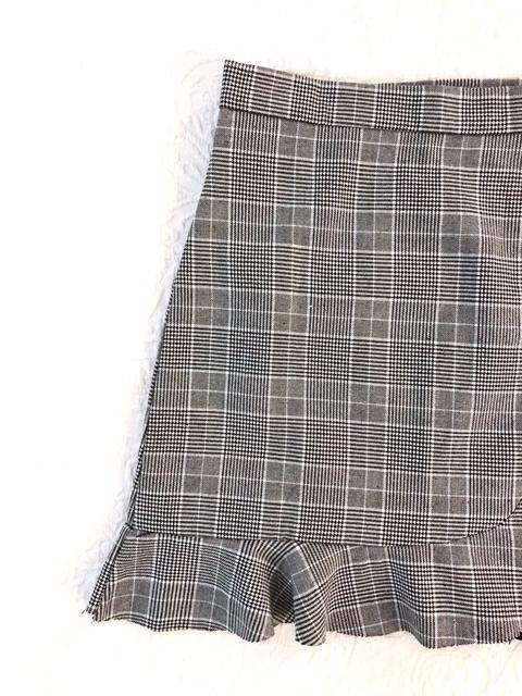 Una monada de falda corta con estampado de cuadro de gales y bajo con volante asimétrico.