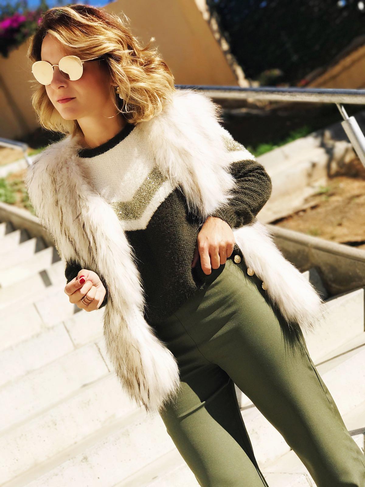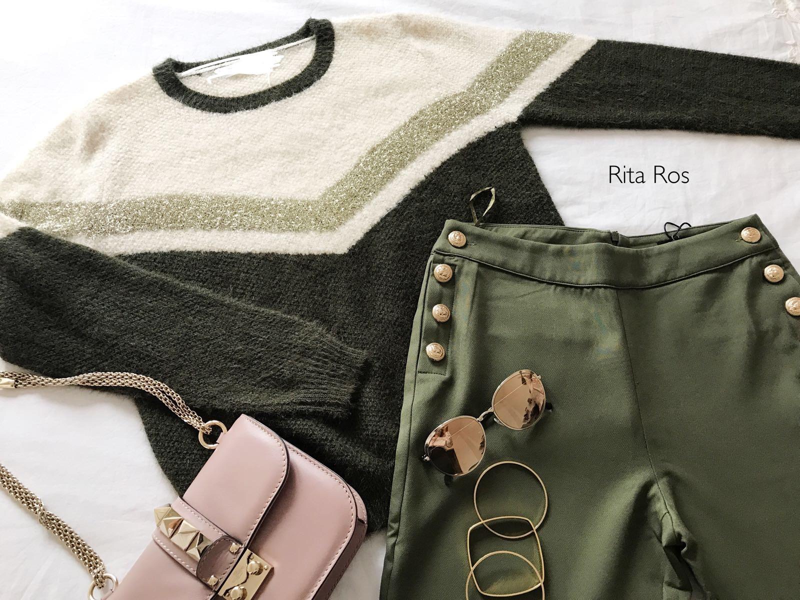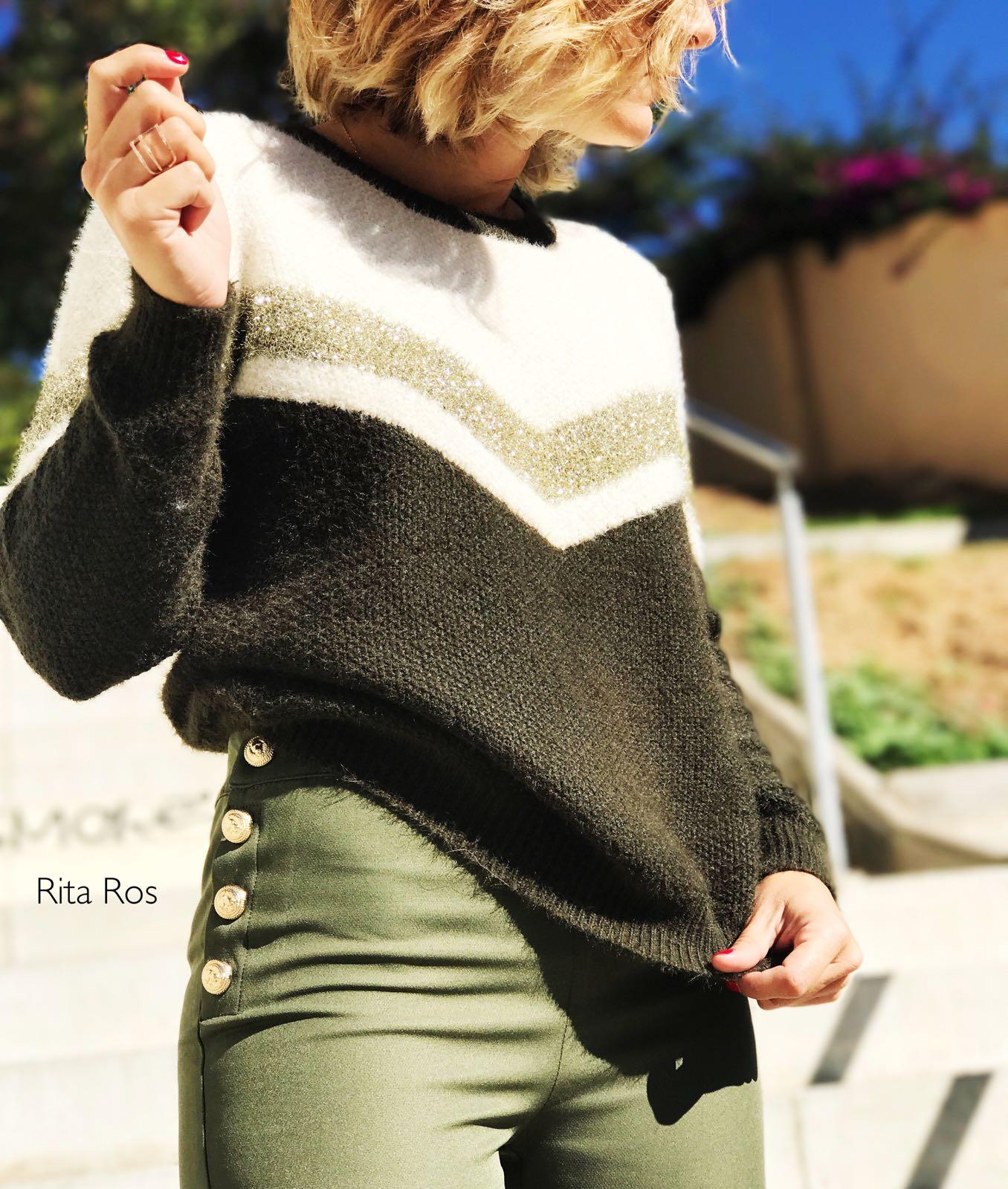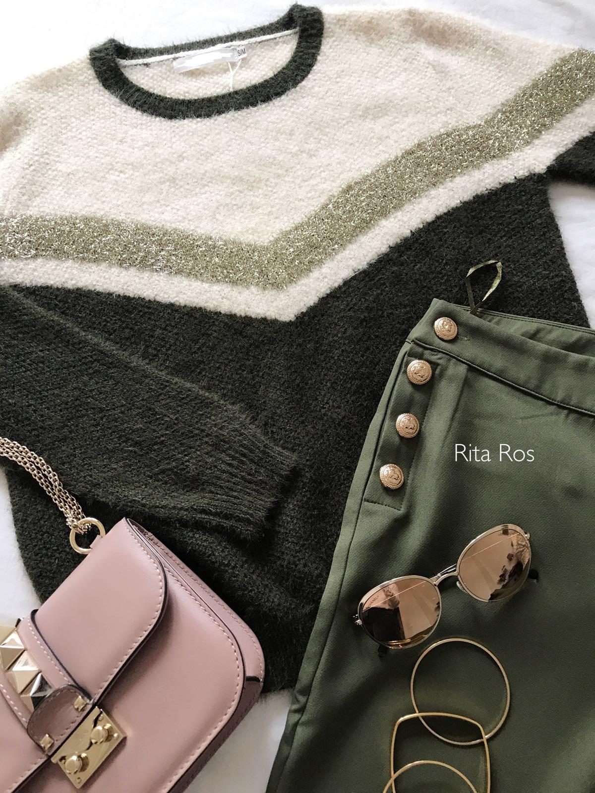 Nuevo jersey color verde kaki y beige super amoroso con detalles dorados que lo hacen una prenda super dulce y especial.