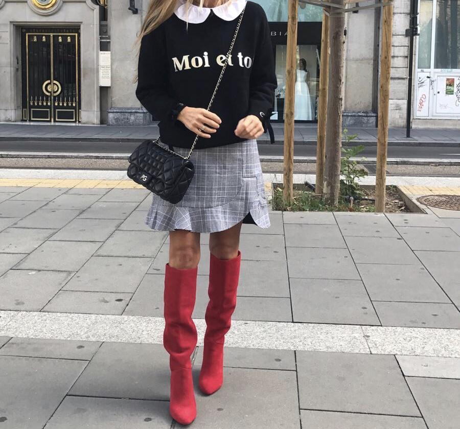 Una monada de jersey en color negro con detalle escrito y lacito en las mangas. Lo hemos combinado con nuestra camisa blanca cuello volantes y nuestra falda cortita de cuadros de gales y el outfit es una moneria.