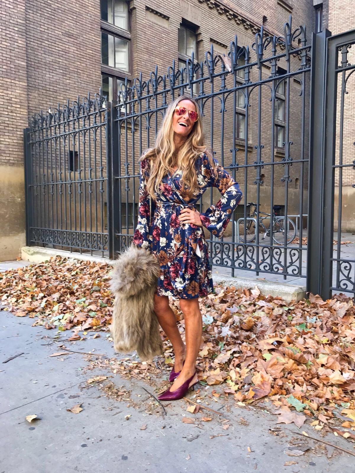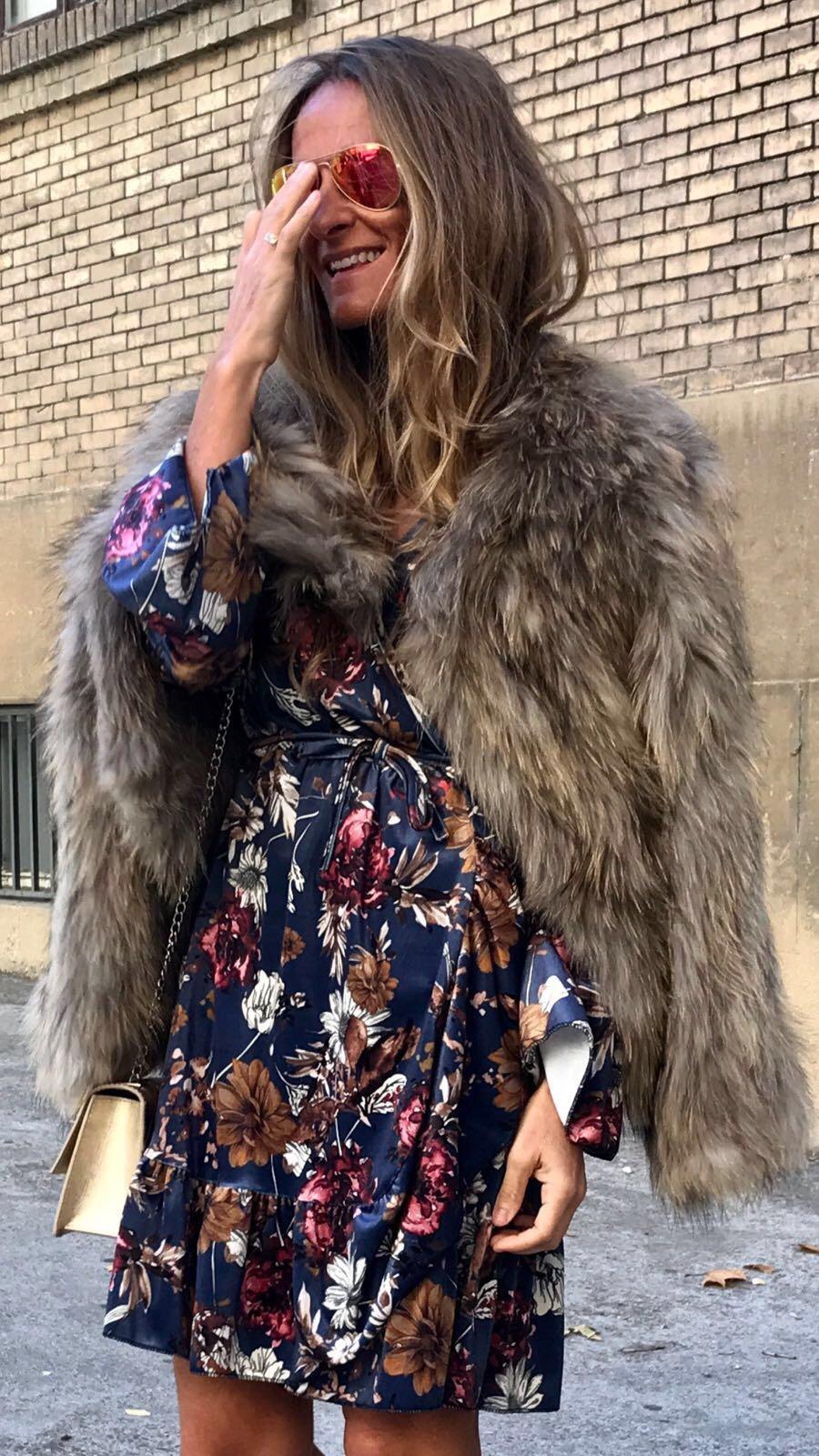Nuevo vestido corto en terciopelo de estilo cruzado con un estampado de flores súper bonito. Lo hemos combinado con nuestra chaqueta de pelo y queda espectacular.