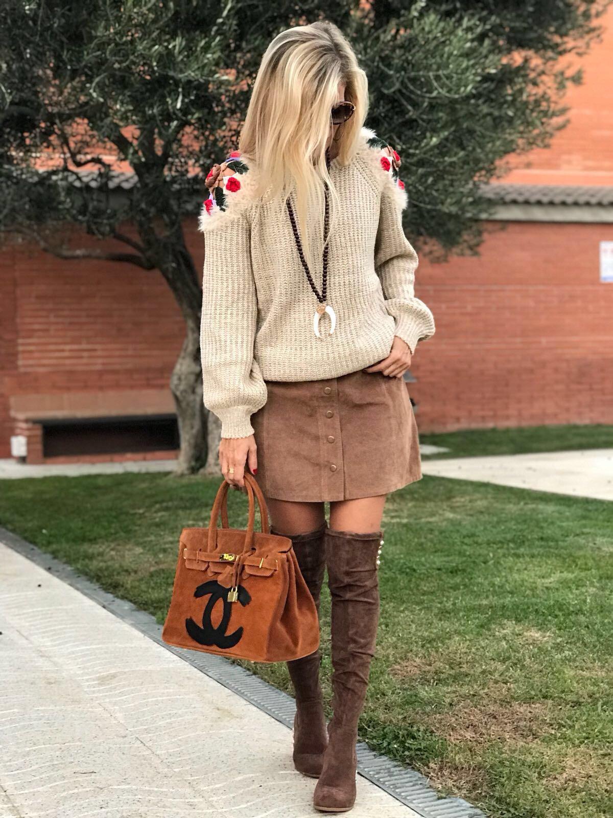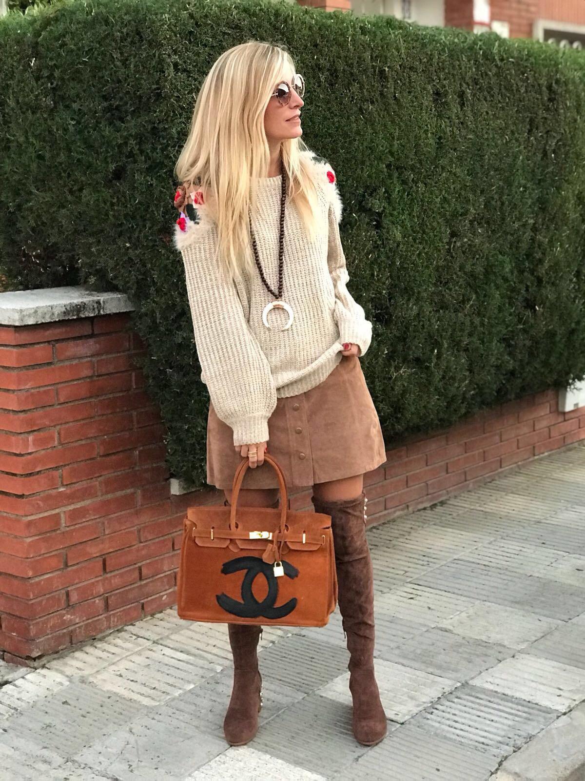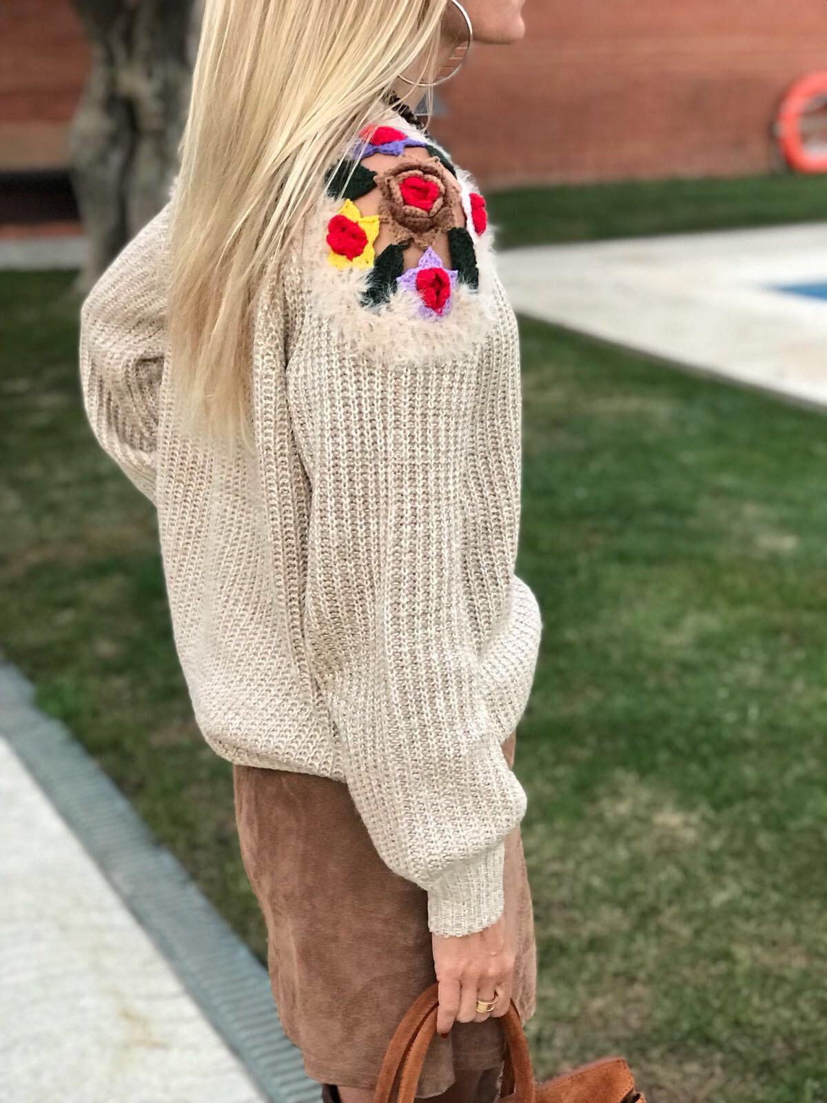 Una monada de jersey en color beige con precioso detalle floral en los hombros hecho de crochet