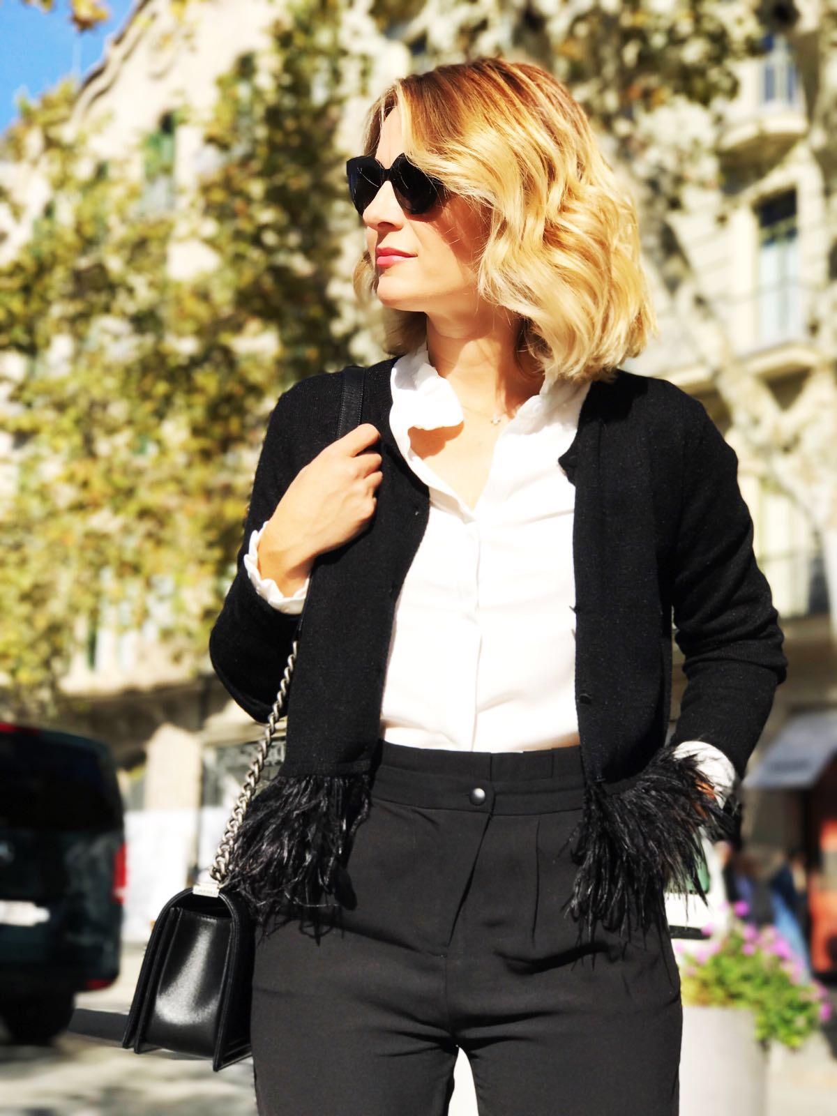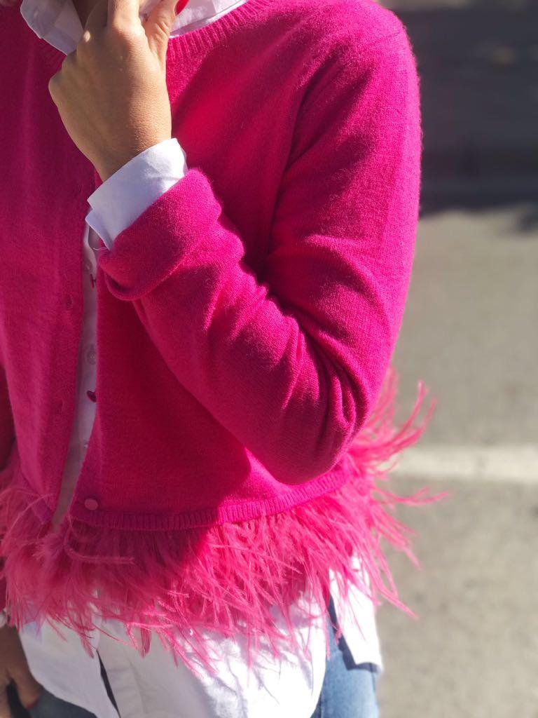 Preciosa chaqueta de punto con botones y detalle de plumas en el bajo. Tiene un tacto súper amoroso.