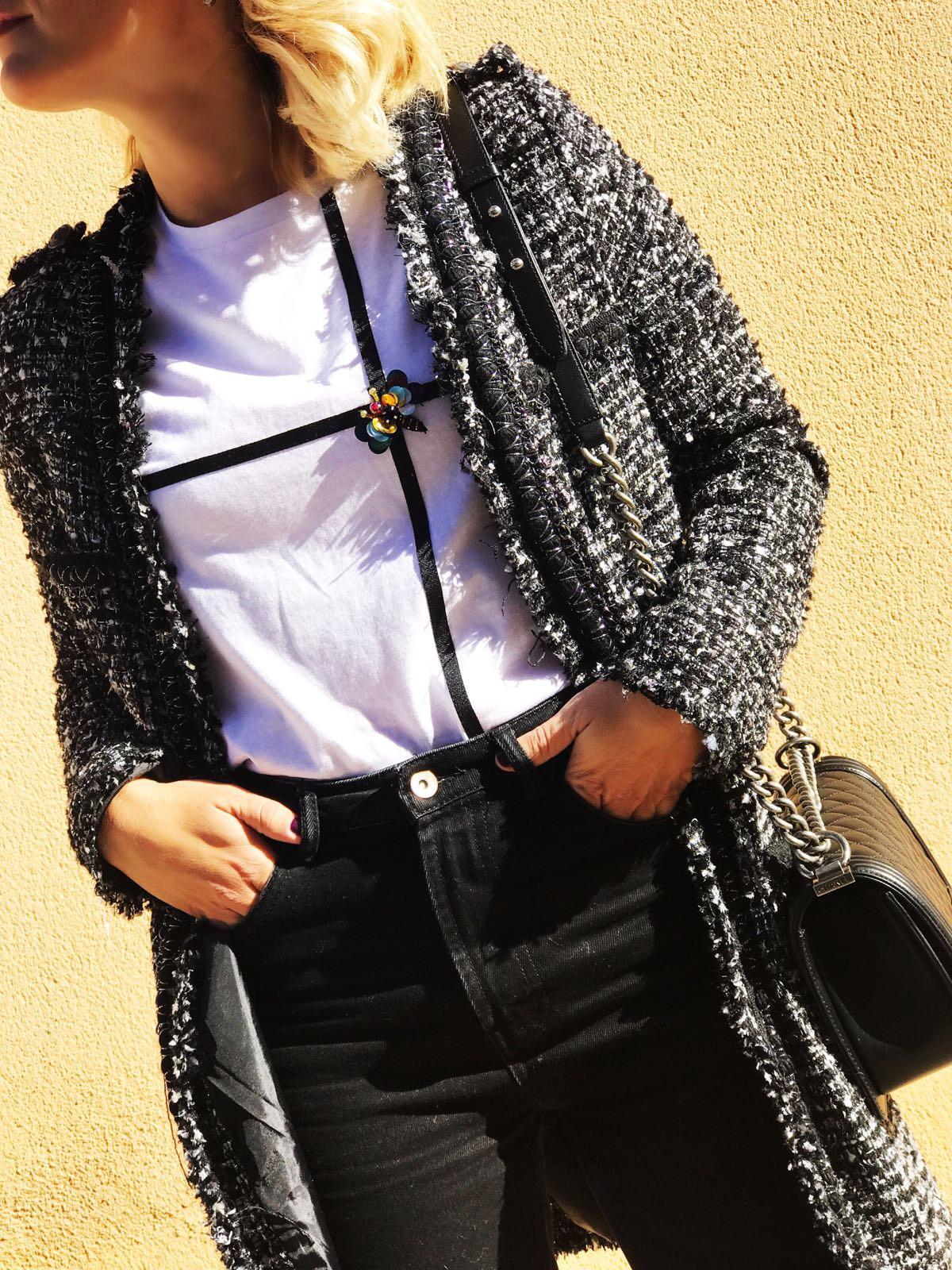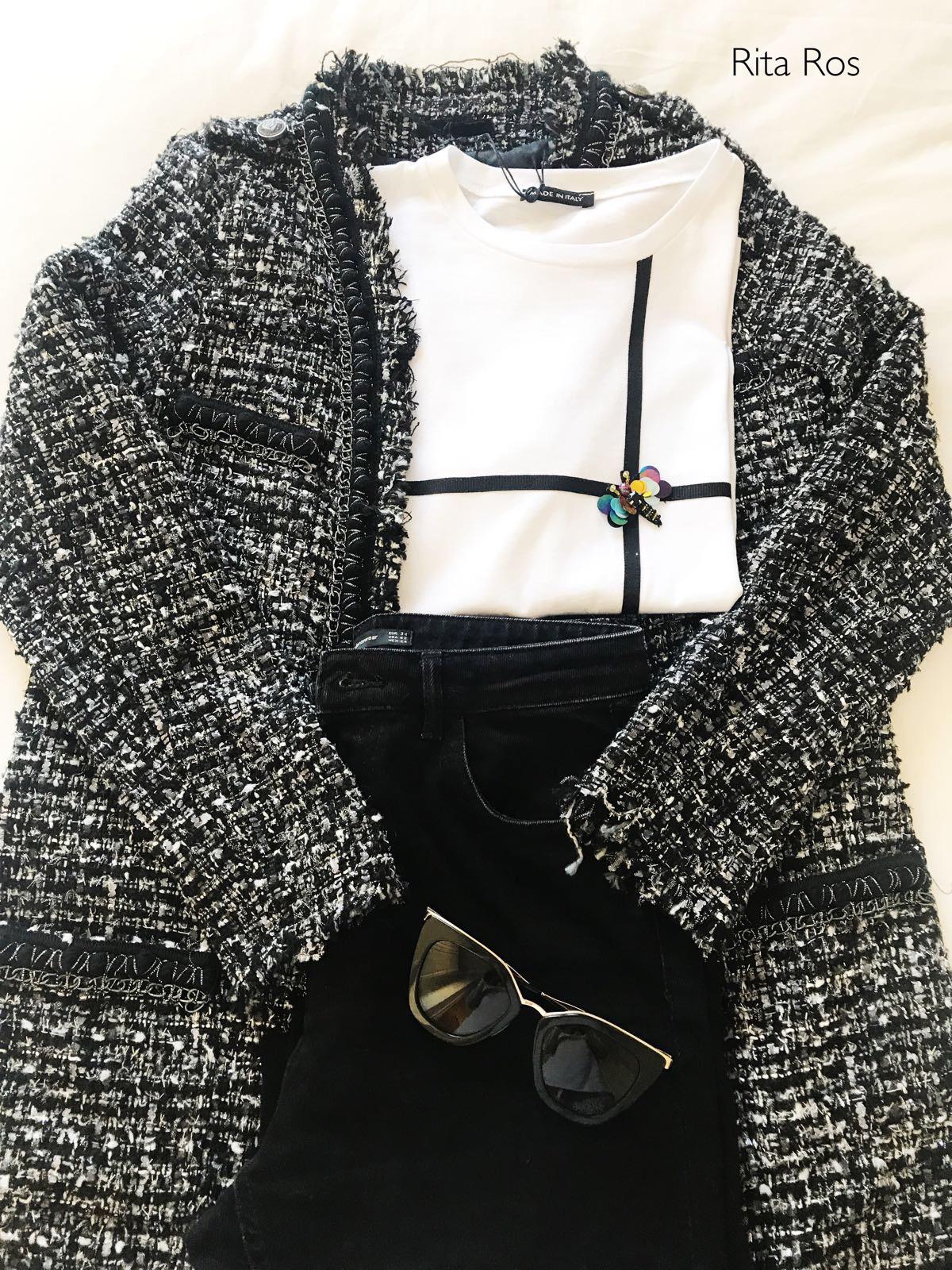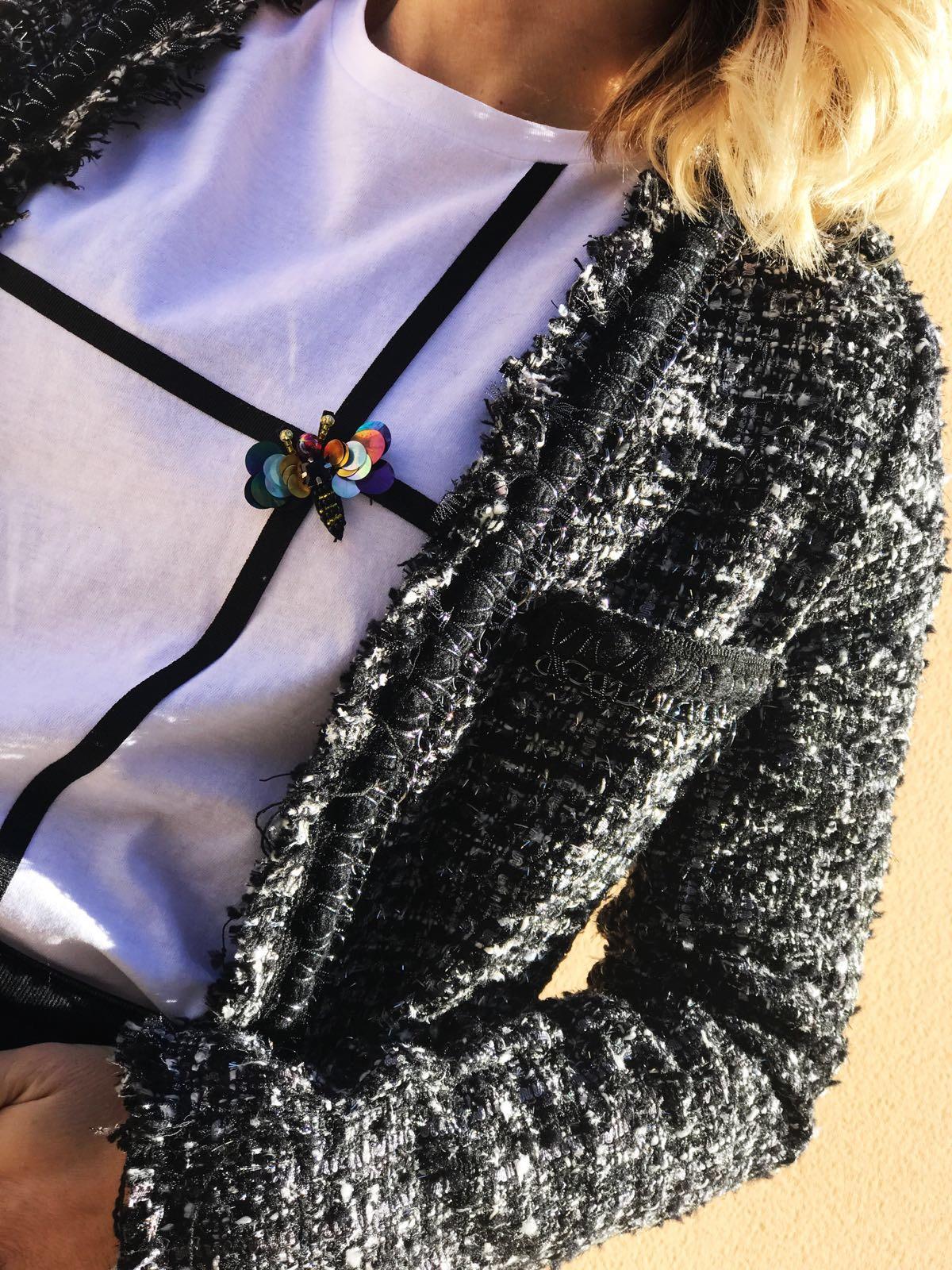 La hemos combinado con nuestra levita Tweed en tonos blanco y negro y la combinación queda genial!