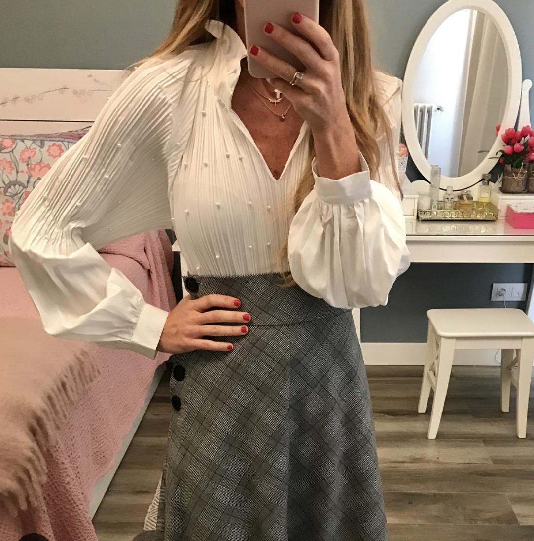 Preciosa blusa plisada en cuerpo y mangas con cuello mao y precioso detalle de perlitas. Súper femenina!!