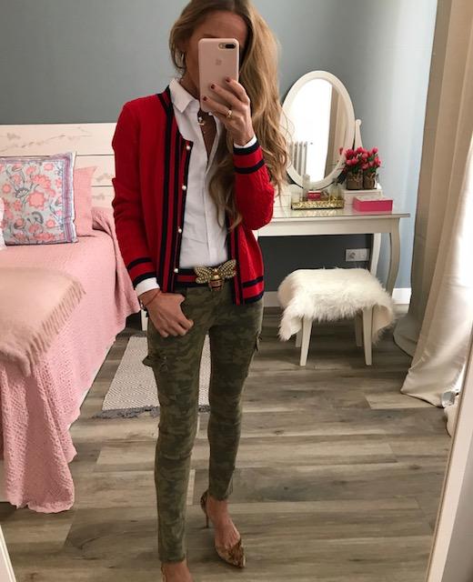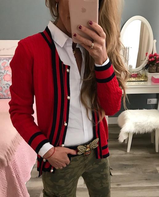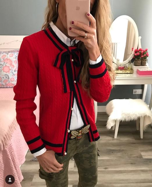 Preciosa chaqueta de punto en color rojo y rayas azul marino. Tejido en ochos con detalle lazo en el cuello monísimo.