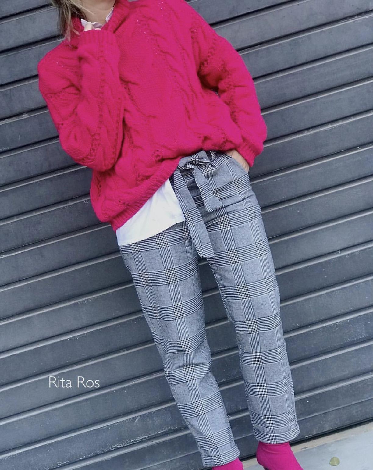 Nuevo pantalón con estampado de gales con lazo, dobladillo en el bajo y bolsillos. Lo hemos combinado con nuestro jersey corto de ochos en fucsia y queda genial la combinación.
