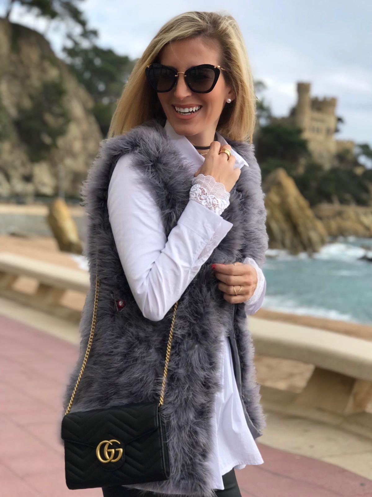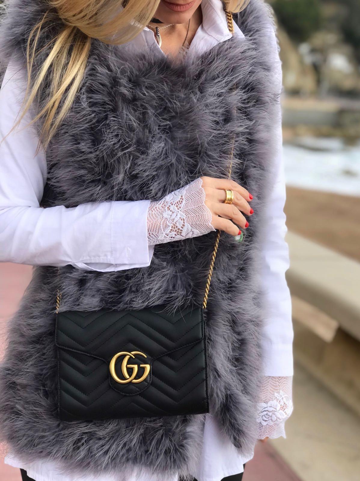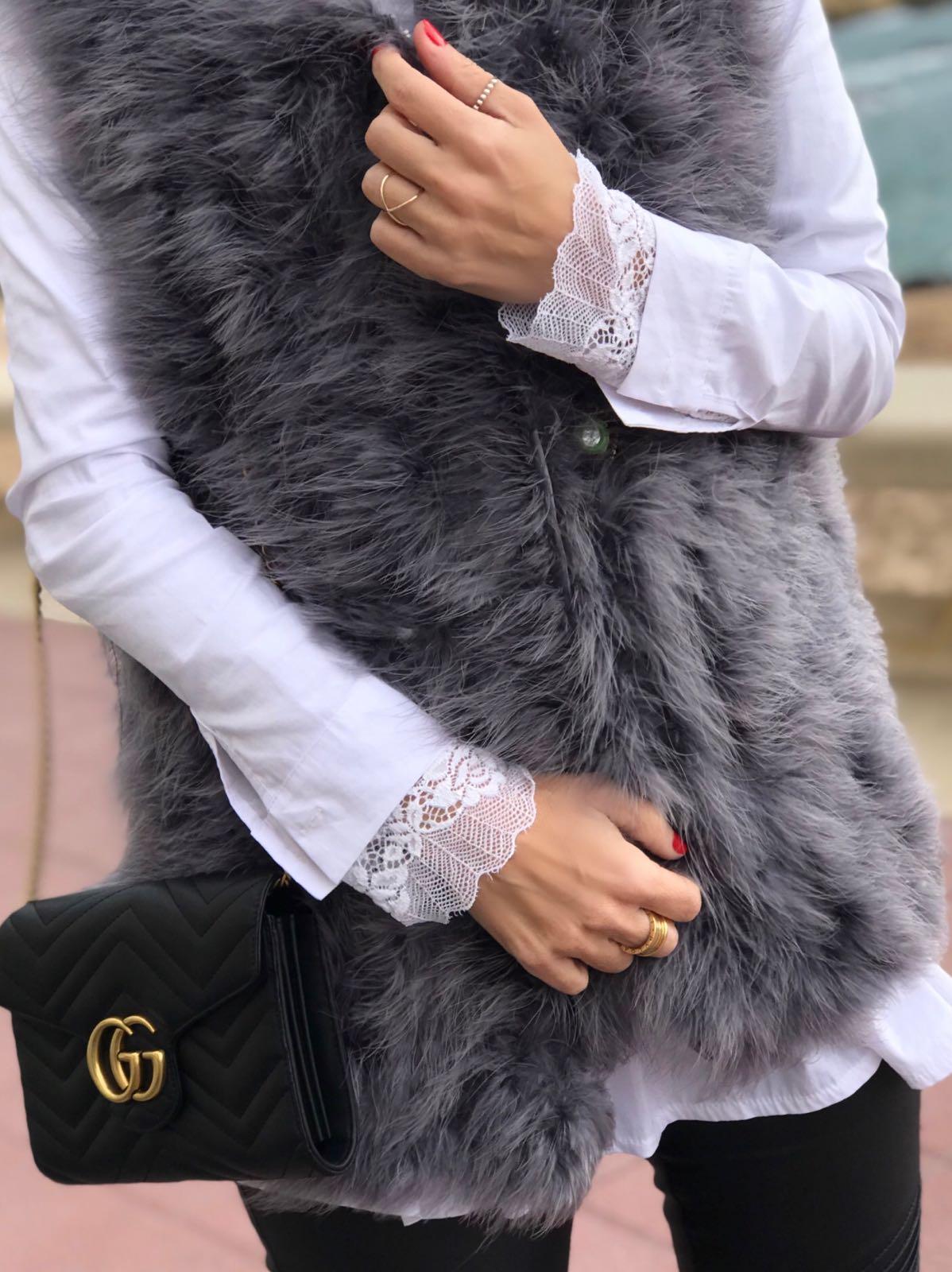 Espectacular chaleco de plumas con detalle de pedrería y espejos en la cintura.