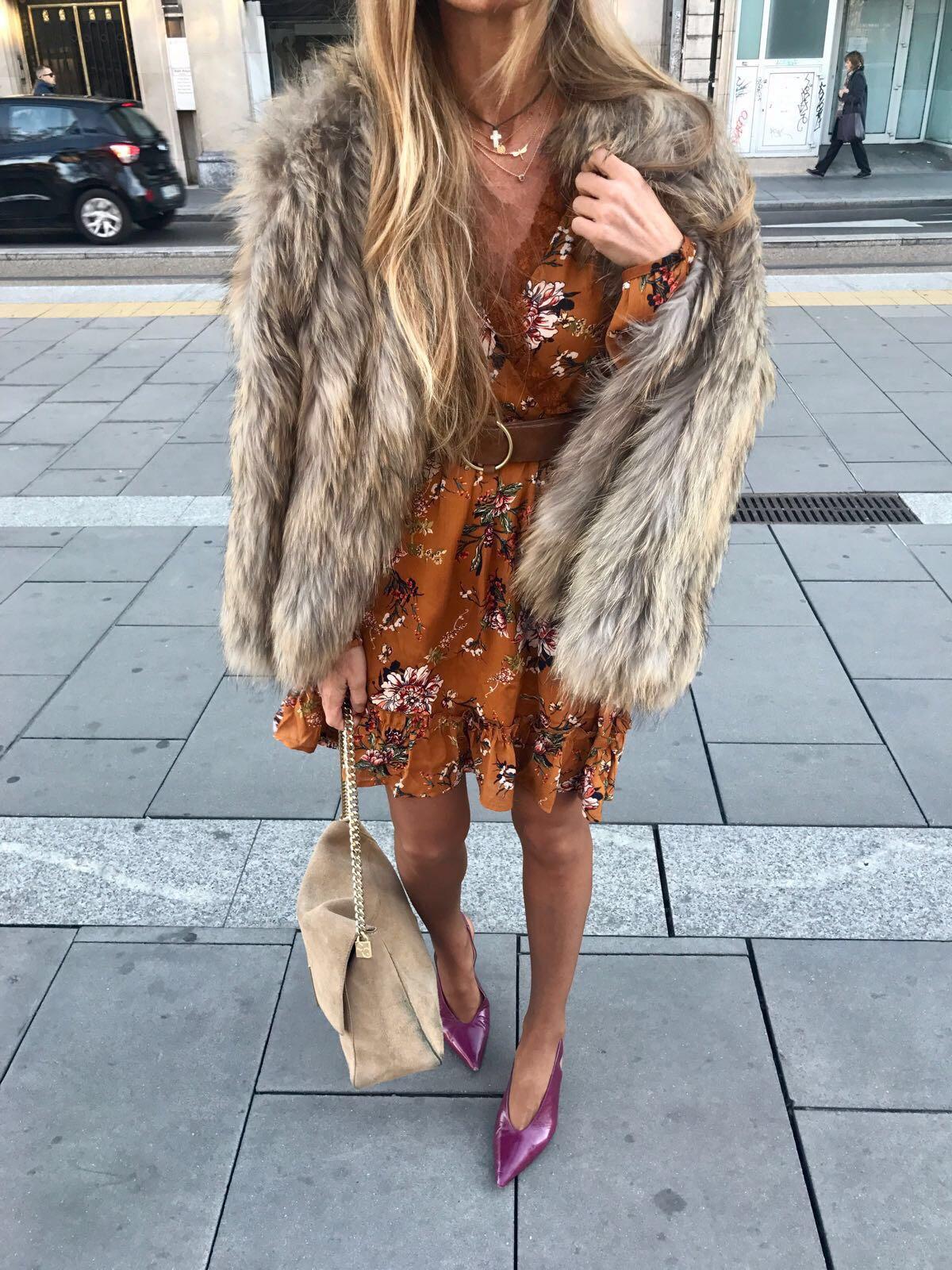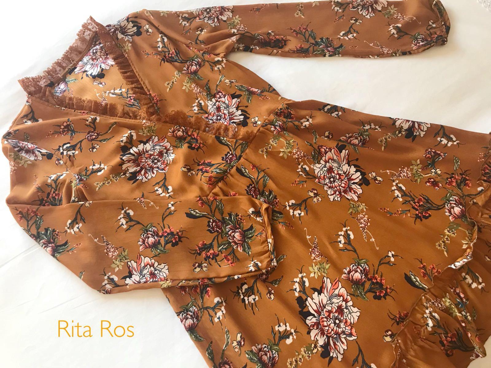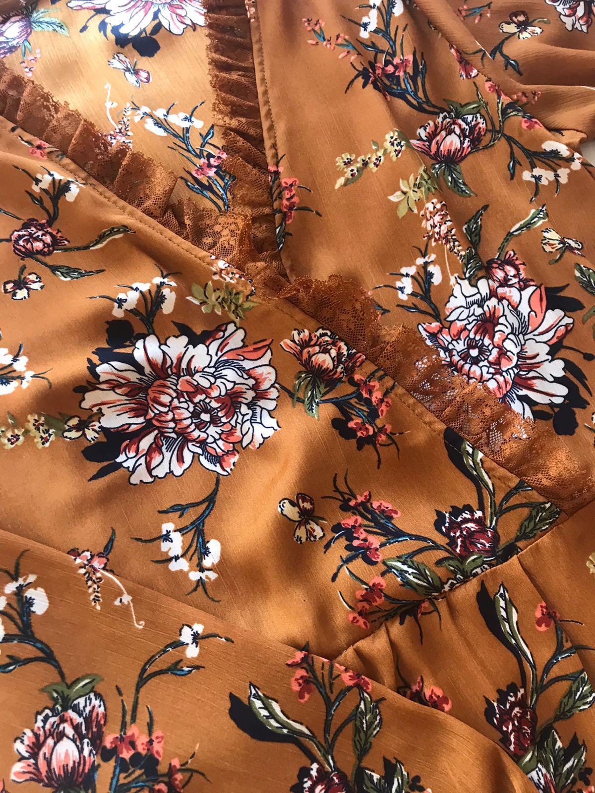 Precioso vestido con estampado de flores sobre un color camel que enamora.Detalle encaje en cuello y escote cruzado