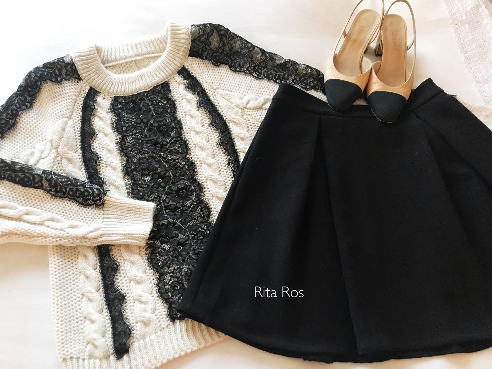 Preciosa falda corta en color negro con detalle plisado. La hemos combinado con nuestro jersey ochos con encaje en negro y la combinación es perfecta.