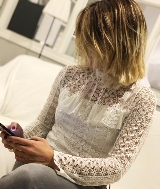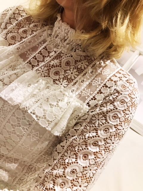 Una preciosidad de blusa toda de encaje con cuello medio alto y detalle de volantito, una prenda súper elegante!