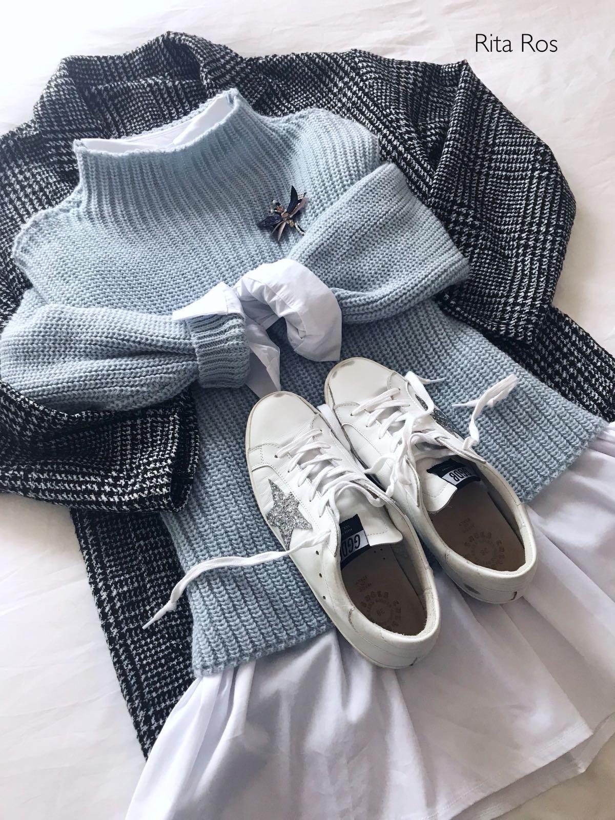 Una monada de jersey corto de punto con cuello medio alto y manga de hombro caído. Incluye el broche que es súper bonito.
