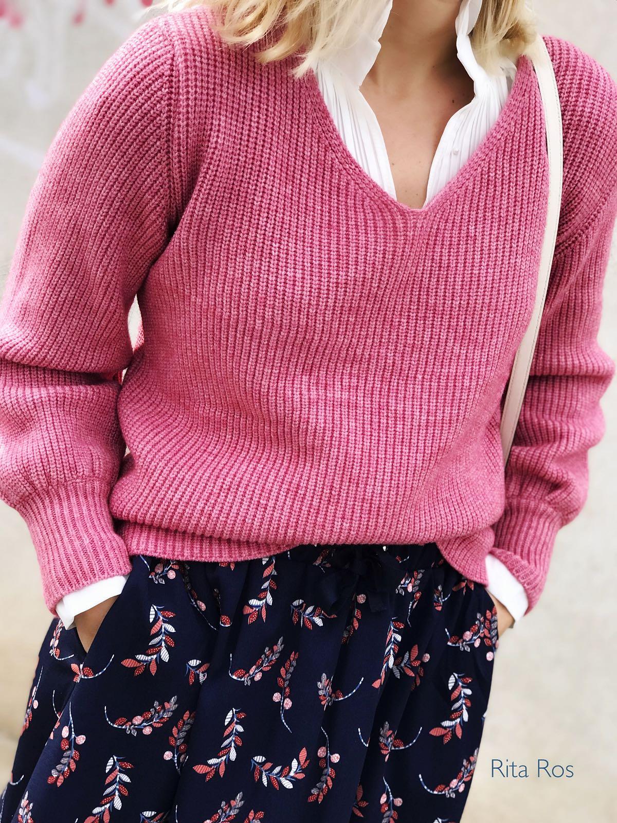 Preciosa falda corta con un estampado de hojitas monísimo sobre fondo azul marino. Combínala con un jersey de punto y unos botines. Nosotros la hemos combinado con nuestro jersey Simone color frambuesa y la combinación es perfecta!