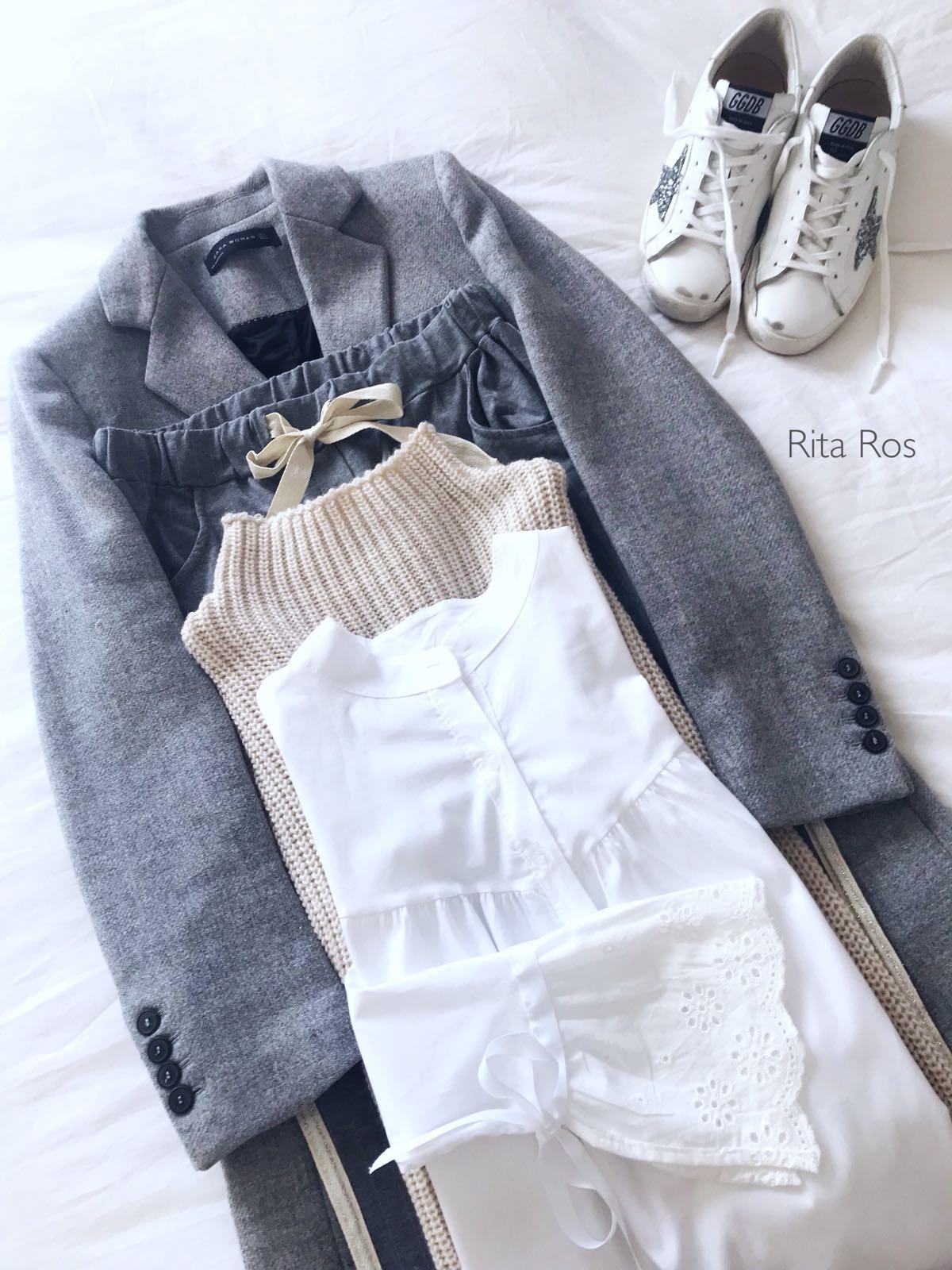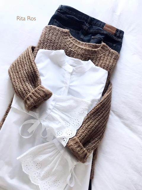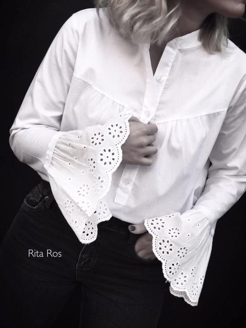 Preciosa blusa de cuello mao abotonada hasta el pecho. Mangas acabadas con una maravilla de bordado y lazo en el puño. La hemos combinado con el pantalon de rayas en gris y el jersey broche en crudo y queda una combinación súper bonita y moderna.
