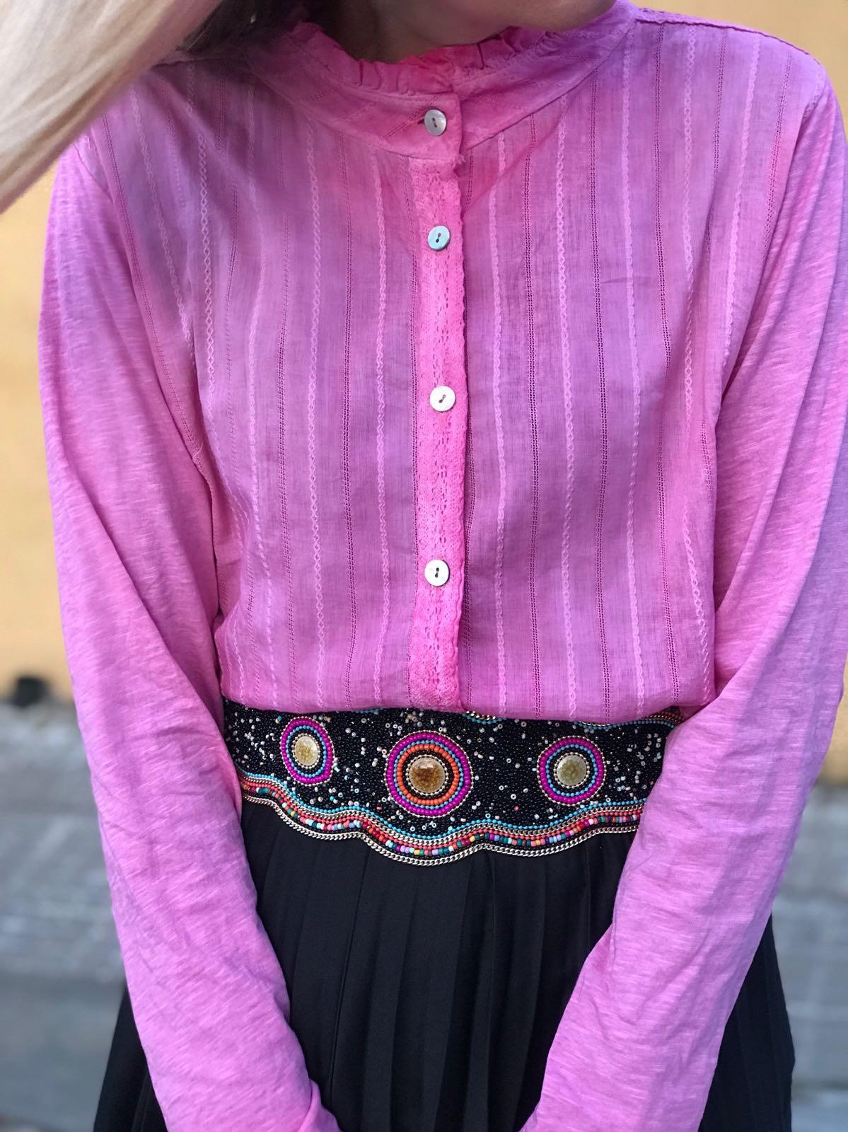 Blusa camiseta con cuello mao y volantito con precioso encaje en hombros y en el cierre de los botones.