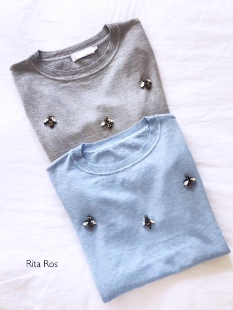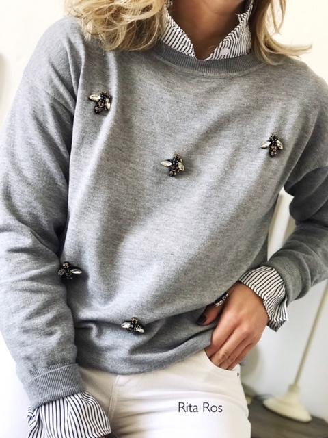 Una monada de jersey con un punto genial y con detalle de pedrería en forma de abeja. Lo hemos combinado con nuestra blusa Julia de rayas negras y es una perfecta combinación.