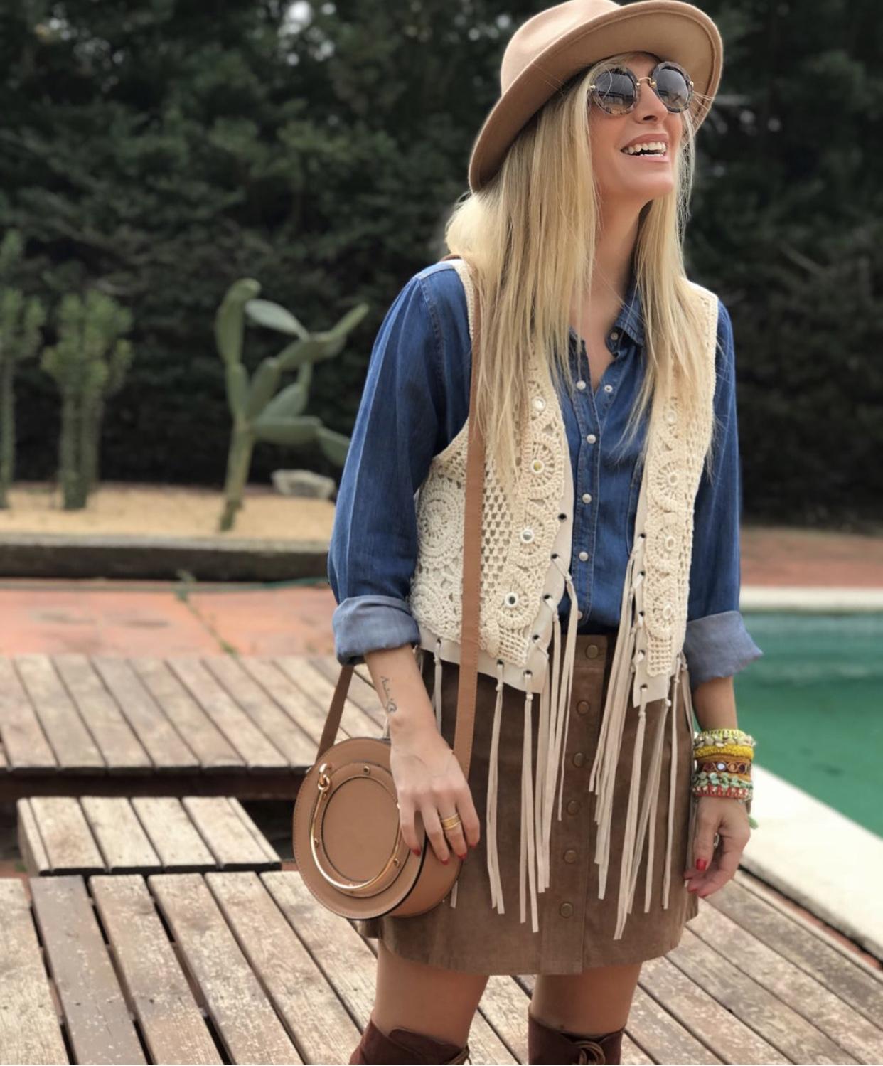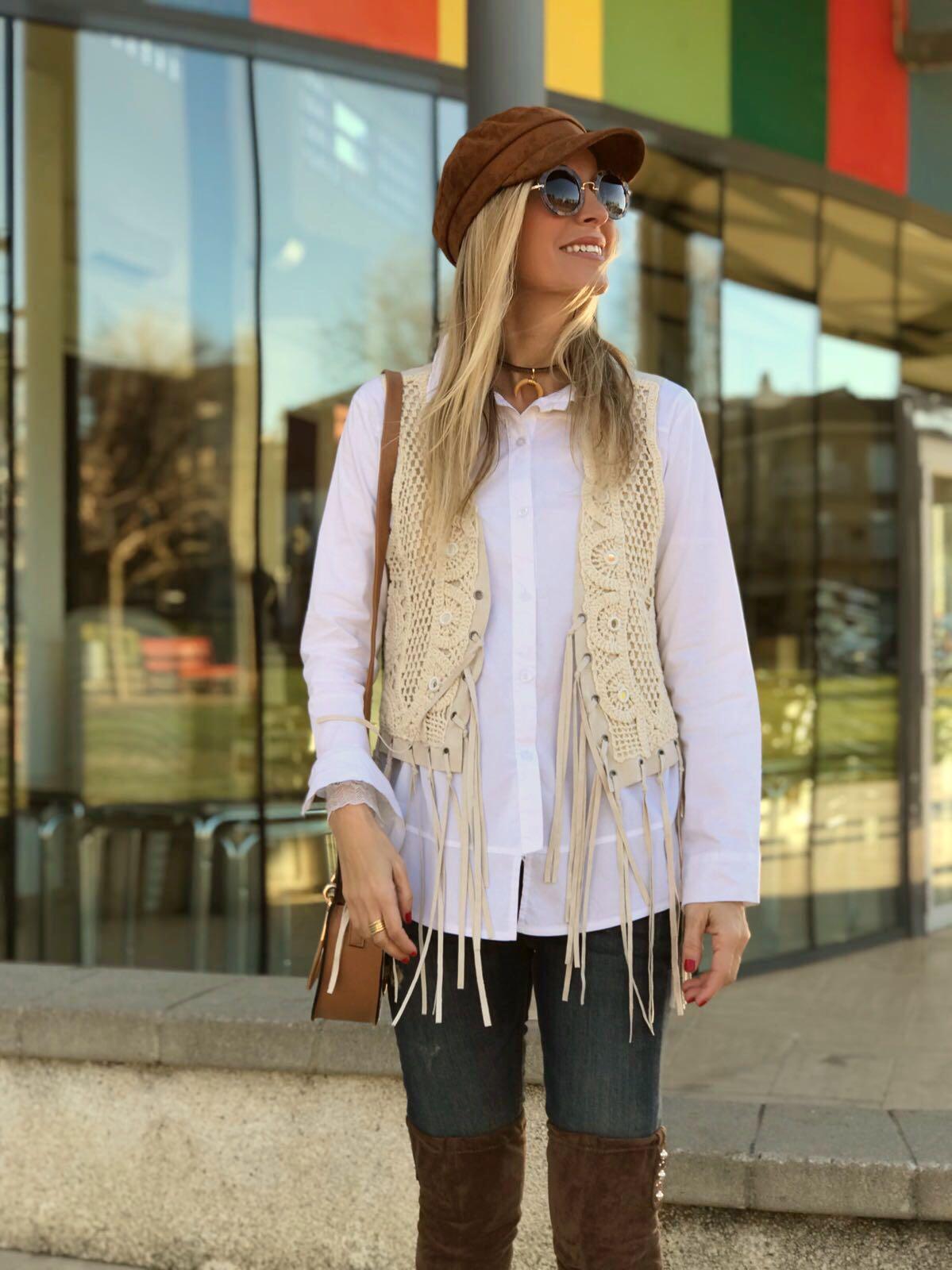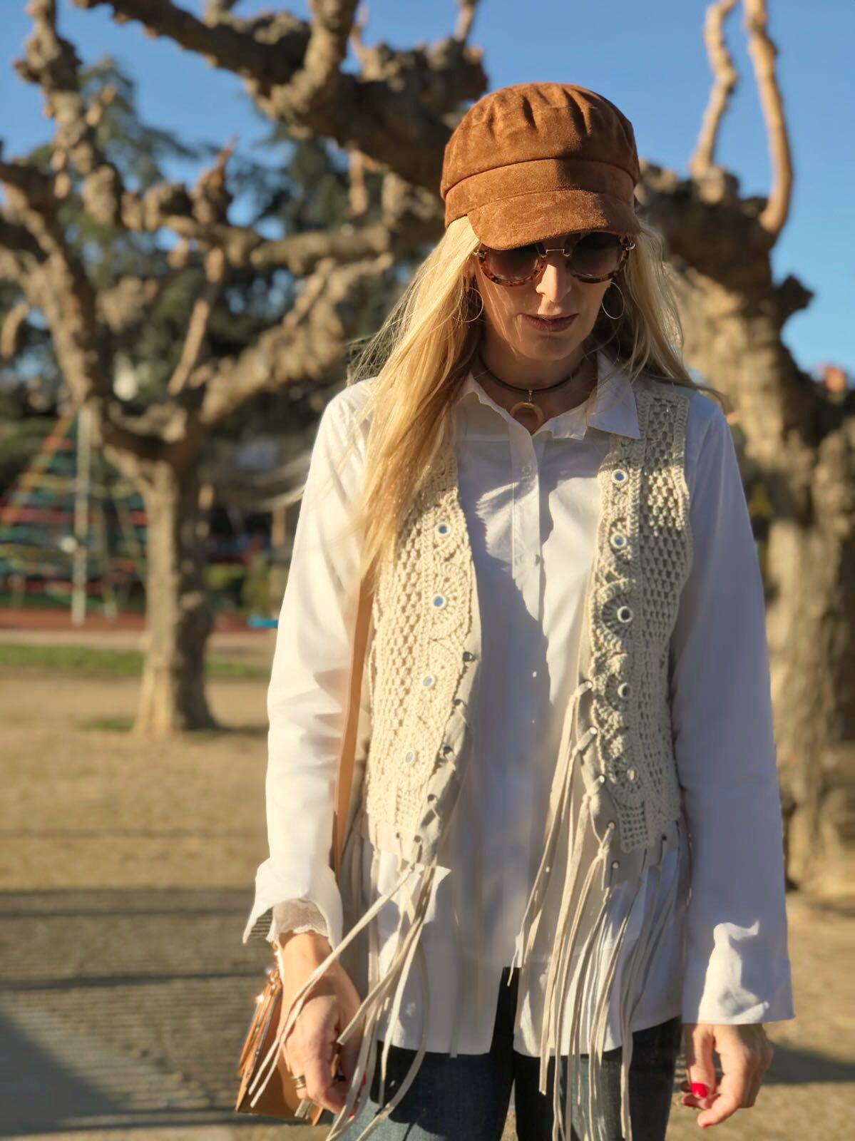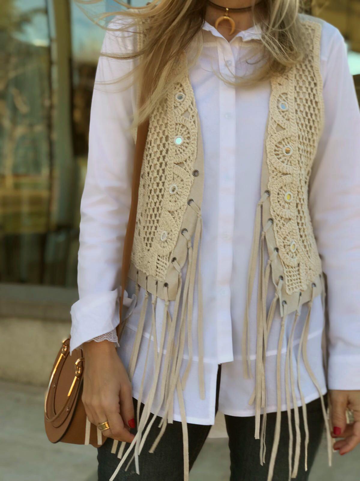 Chaleco de antelina y crochet de estilo Boho con detalles de espejitos y flecos. Una prenda preciosa con mucha personalidad.