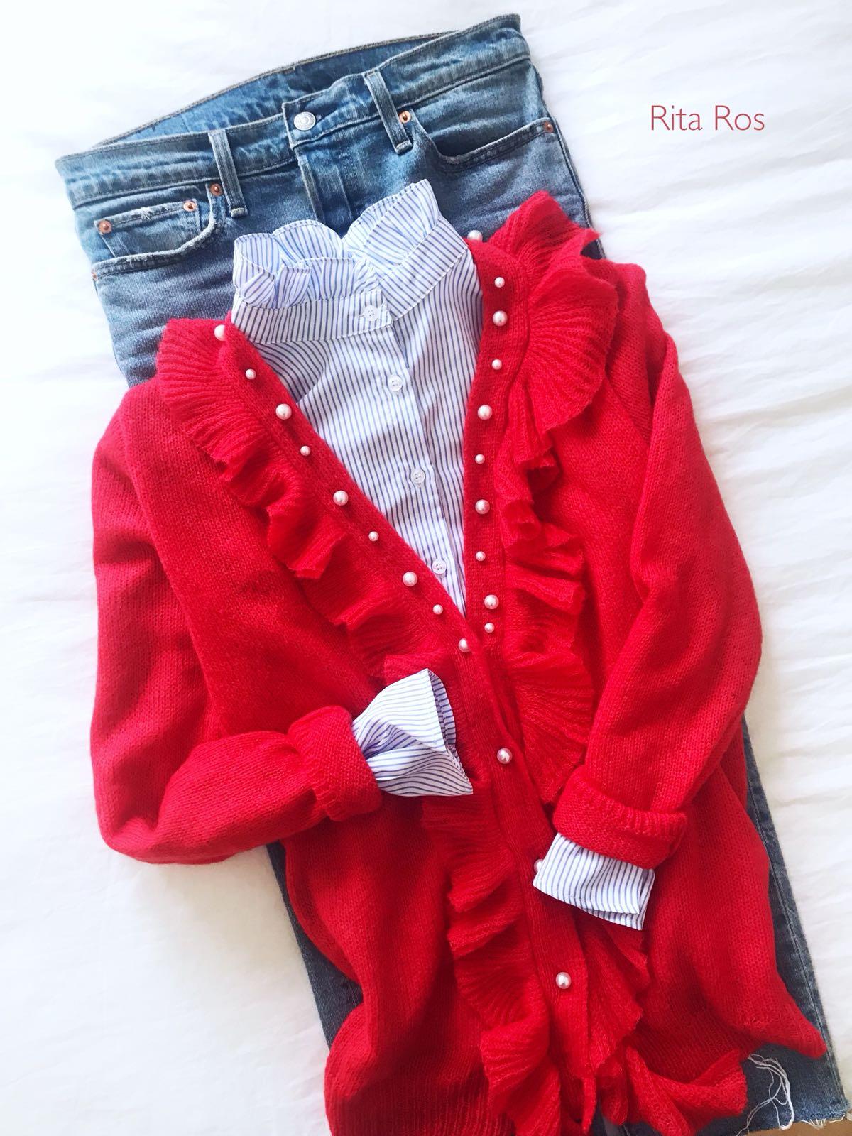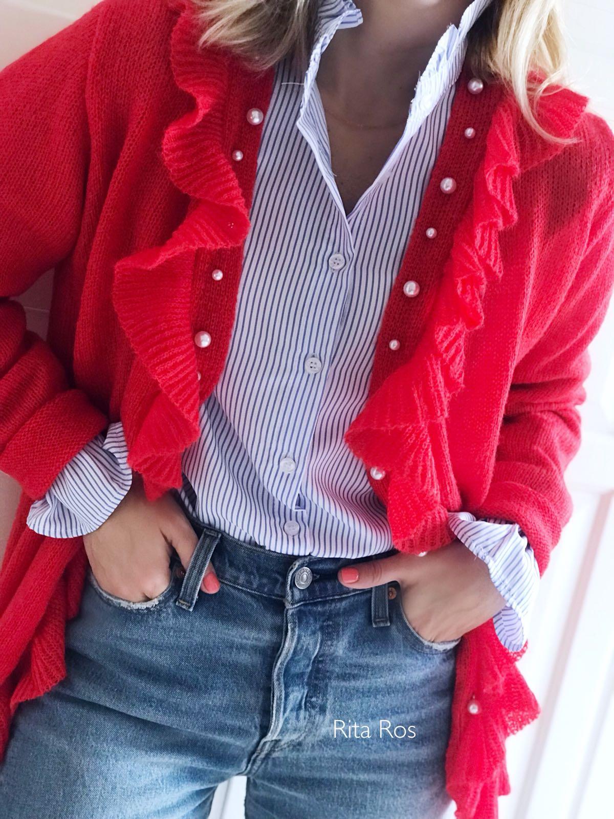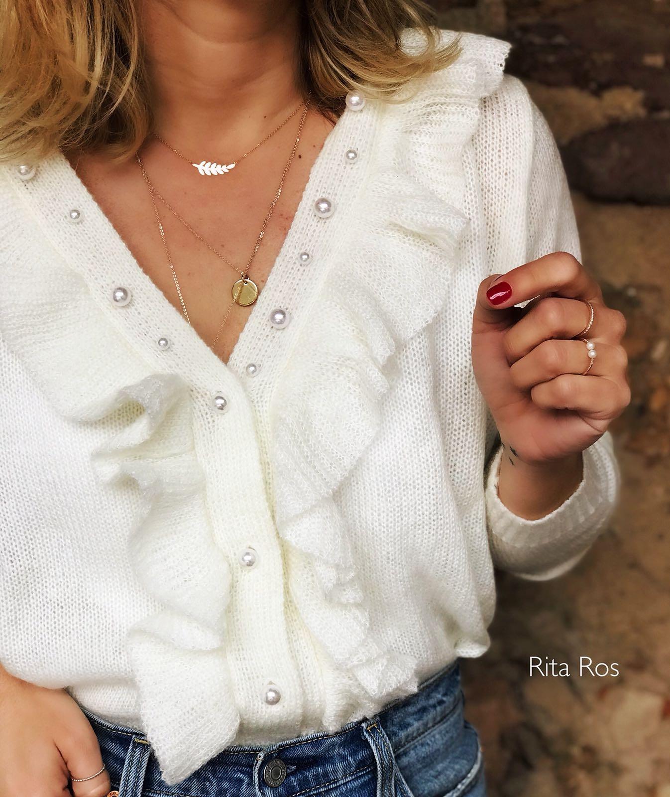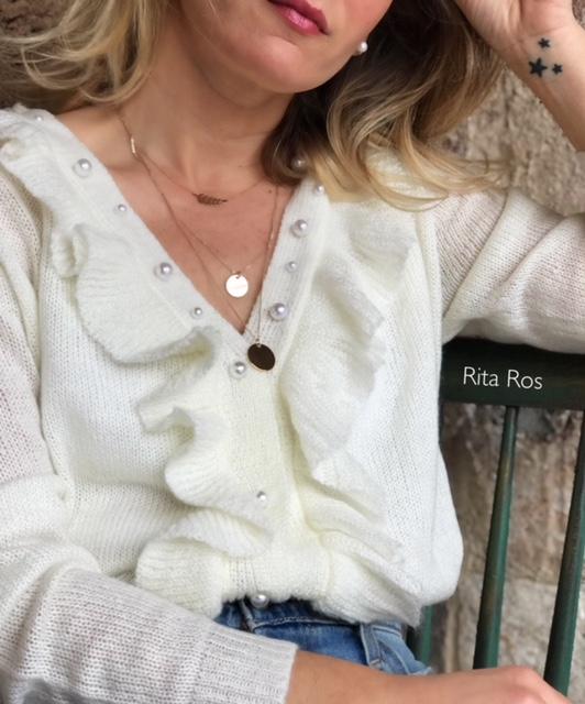 Chaqueta de punto con detalle de botones de perlas y volantes en solapas. Una clásica diferente con mucho encanto.
