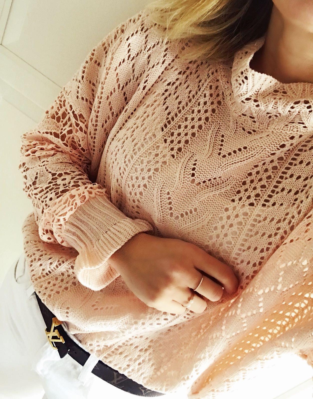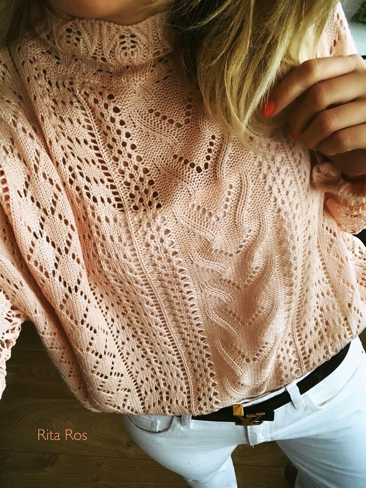 Jersey ancho de punto calado, cuello medio alto y detalle de manga larga bordada. Puños acabados en punto de canalé y volantito.